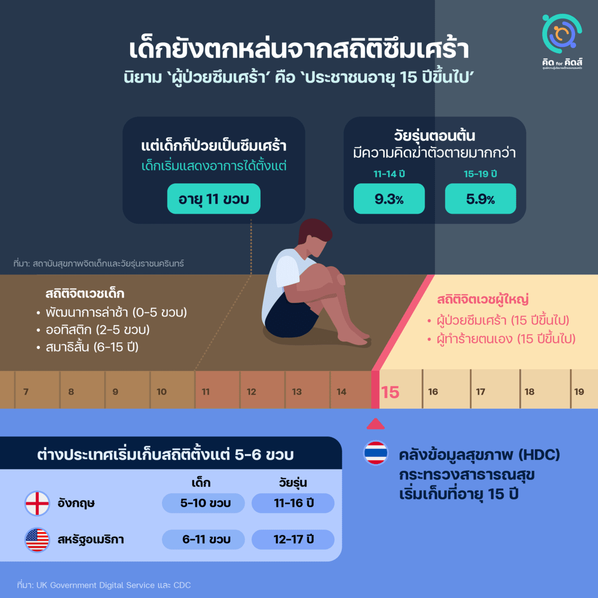 ช่วงวัย 11-14 ปีนับเป็นช่วงวิกฤตที่โรคซึมเศร้าในเด็กจะพัฒนาจนกลายเป็นโรคจิตเวชผู้ใหญ่ หรือกระทั่งทำให้พวกเขาไม่ได้เติบโตมาเป็นผู้ใหญ่เลย การติดตามตัวเลขผู้ป่วยซึมเศร้าในวัยนี้จึงมีความสำคัญอย่างยิ่ง ในอังกฤษมีการเก็บสถิติผู้ป่วยซึมเศร้าตั้งแต่อายุ 5 ขวบ[11] ส่วนสหรัฐอเมริกาเริ่มต้นที่ 6 ขวบ[12] ปัจจุบันไทยมีเครื่องมือคัดกรองโรคซึมเศร้าในเด็กที่ออกแบบมาให้ใช้ได้กับเด็กตั้งแต่วัย 7 ขวบ และมีแบบคัดกรองขนาดกระชับสำหรับวัย 11-20 ปี ซึ่งถูกใช้ในโรงเรียนและระบบประเมินสุขภาพจิตออนไลน์อย่างกว้างขวาง การนิยามตัวเลขและกำหนดตัวชี้วัดด้านจิตเวชเด็กที่เกี่ยวข้องกับโรคซึมเศร้า จึงควรได้รับการปรับปรุงให้ครอบคลุมอย่างน้อยจนถึงวัย 11 ขวบ เพื่อให้ระบบสามารถติดตามยับยั้งภาวะซึมเศร้าตั้งแต่ในระยะเริ่มต้น