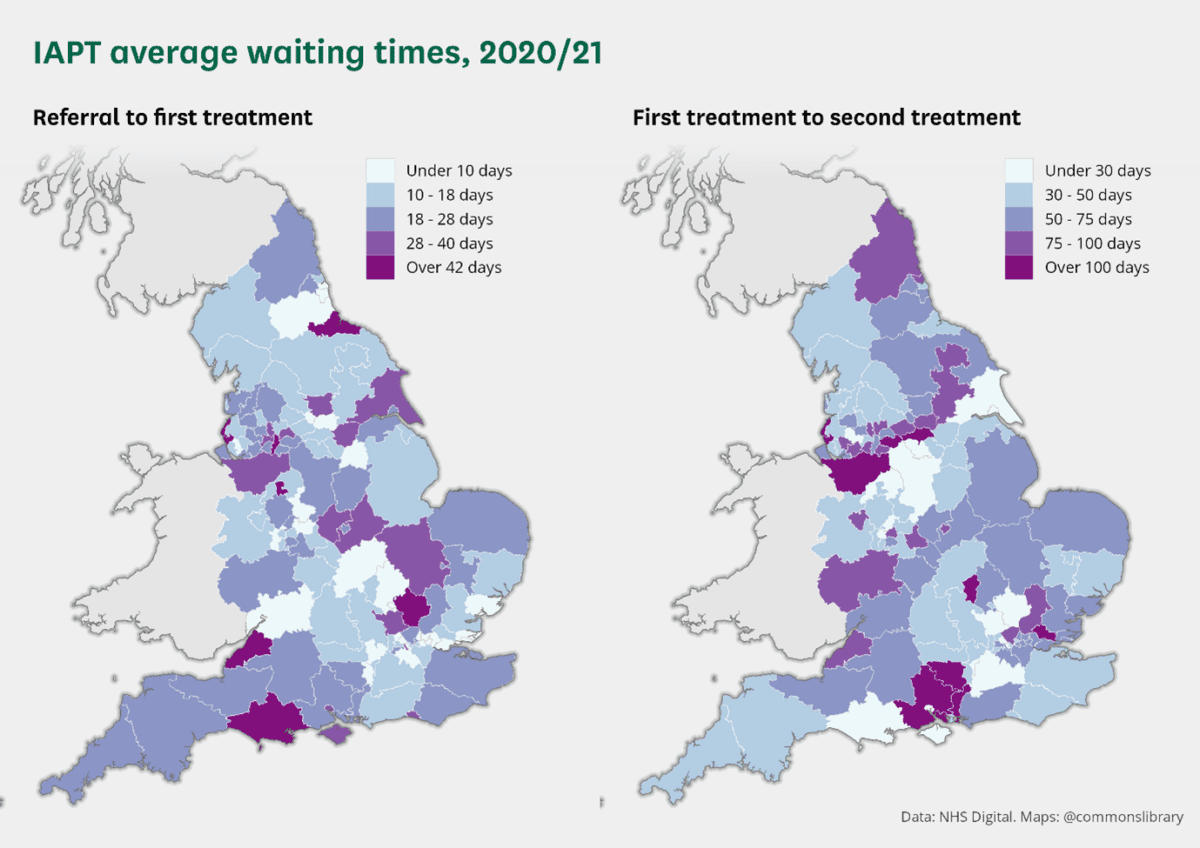 โครงการ IAPT ในอังกฤษใช้ ‘เวลารอคอย’ ติดตามว่าผู้ป่วยได้เข้ารับการบำบัดครั้งแรกภายในเวลาเท่าใด ตัวชี้วัดนี้ไม่เพียงแต่สะท้อนถึงการให้บริการได้อย่างทันท่วงที แต่ยังสะท้อนถึงความพร้อมของการให้บริการในแต่ละพื้นที่ ซึ่งอาจมีเงื่อนไขและความต้องการบุคลากรในสัดส่วนที่แตกต่างกันออกไป