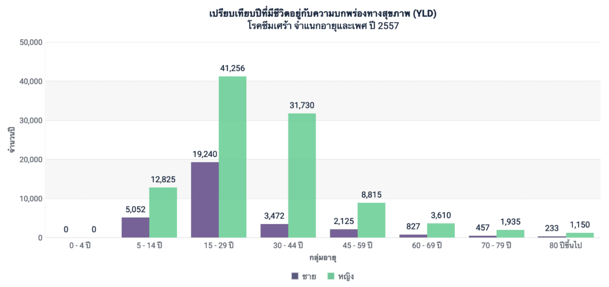 การฆ่าตัวตายเป็นเพียงปลายภูเขาน้ำแข็งของปัญหาจิตเวช สำหรับคนที่ฆ่าตัวตายไม่สำเร็จหรือตัดสินใจที่จะมีชีวิตอยู่ต่อไป การเจ็บป่วยทางใจเป็นภาระหนักอึ้งที่ต้องฝ่าฟันต่อไปในทุกๆ วัน ตัวเลข ‘ปีที่มีชีวิตอยู่กับความบกพร่องทางสุขภาพ’ (Years of healthy life lost due to disability) หรือ YLDs[5] ช่วยฉายให้เห็นว่าผู้ที่เจ็บป่วยด้วยโรคต่างๆ ต้องสูญเสียชีวิตที่ดีไปกับโรคนั้นเป็นเวลามากน้อยเพียงใด ในประเทศไทยมีการเก็บรวบรวมและคำนวณข้อมูลล่าสุดในปี 2014 ซึ่งปรากฏว่าโรคซึมเศร้าเป็นสาเหตุลำดับต้นๆ ในเพศหญิง[6] โดยมีสัดส่วนที่สูงกว่าเพศชายในทุกช่วงวัย มากที่สุดในวัยเรียนและวัยทำงานตอนต้น สูงกว่าเพศชายในวัยเดียวกันกว่า 2 เท่า