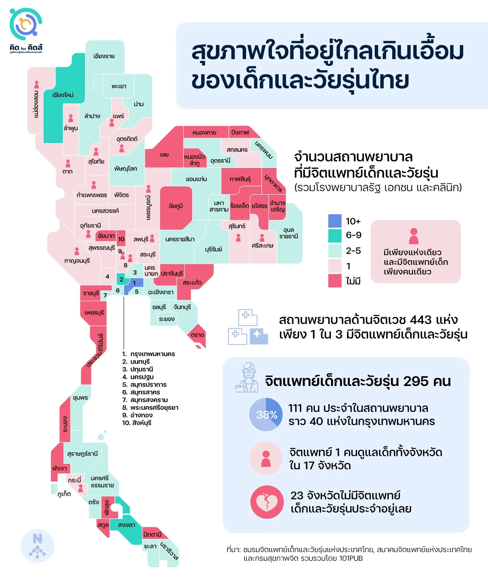 คิด for คิดส์ โดยความร่วมมือระหว่าง 101 PUB กับ สสส. ชวนสำรวจสถานการณ์สุขภาพใจเด็กและเยาวชนไทยผ่านมิติเชิงพื้นที่ของการให้บริการด้านจิตเวชในหนึ่งแผนที่