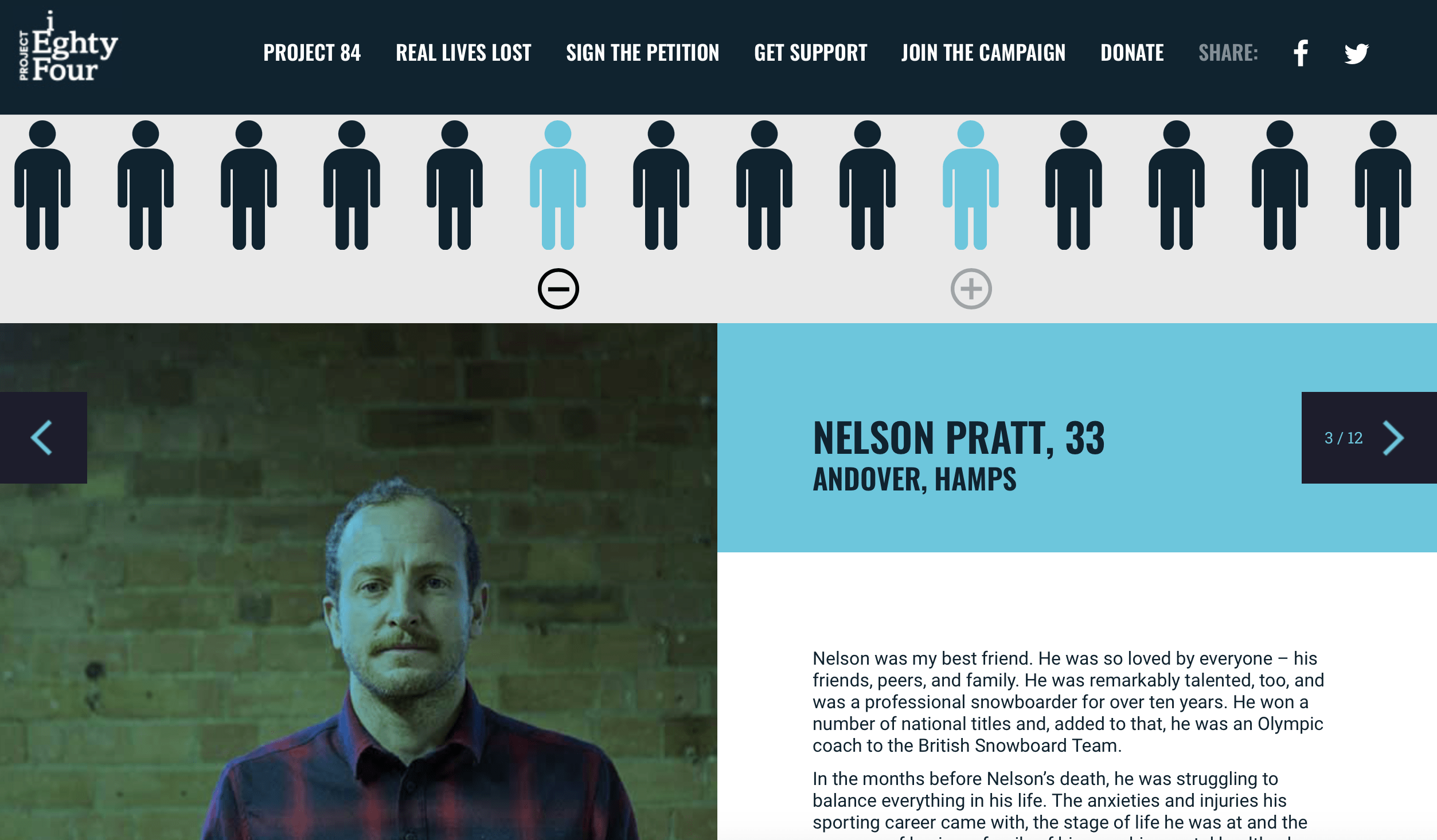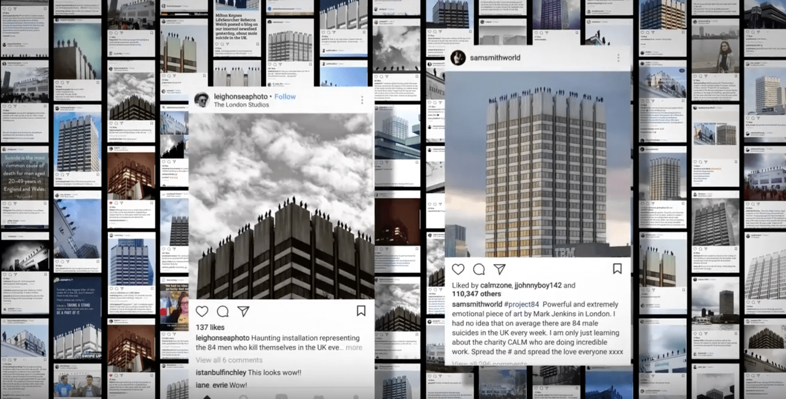 โปรเจคต์นี้องค์กรร่วมมือกับศิลปิน Mark Jenkins สร้าง Installation Art รูปคนขนาดเท่าจริง 84 คน ตั้งไว้บนยอดตึกกลางกรุงลอนดอน ภาพที่มองจากเบื้องล่างราวกับว่าทุกคนกำลังจะกระโดดลงมาปลิดชีวิตตัวเอง โดย Installation Art รูปคนแต่ะชิ้น สร้างจากเรื่องราวของผู้เสียชีวิตจากการฆ่าตัวตาย 84 คน โดยการสัมภาษณ์ผู้ใกล้ชิดหรือครอบครัวที่ยังมีชีวิตอยู่ ใช้ร่างกายของพวกเขาเป็นบล็อกในการทำหุ่นแต่ละตัว โดยให้พวกเขาฝากข้อความลงในนั้น เรื่องราวทั้งหมดยังถูกรวบรวมเป็นฐานข้อมูลในเว็บไซต์ www.projecteightyfour.com ให้คนเข้าไปศึกษาได้ด้วย