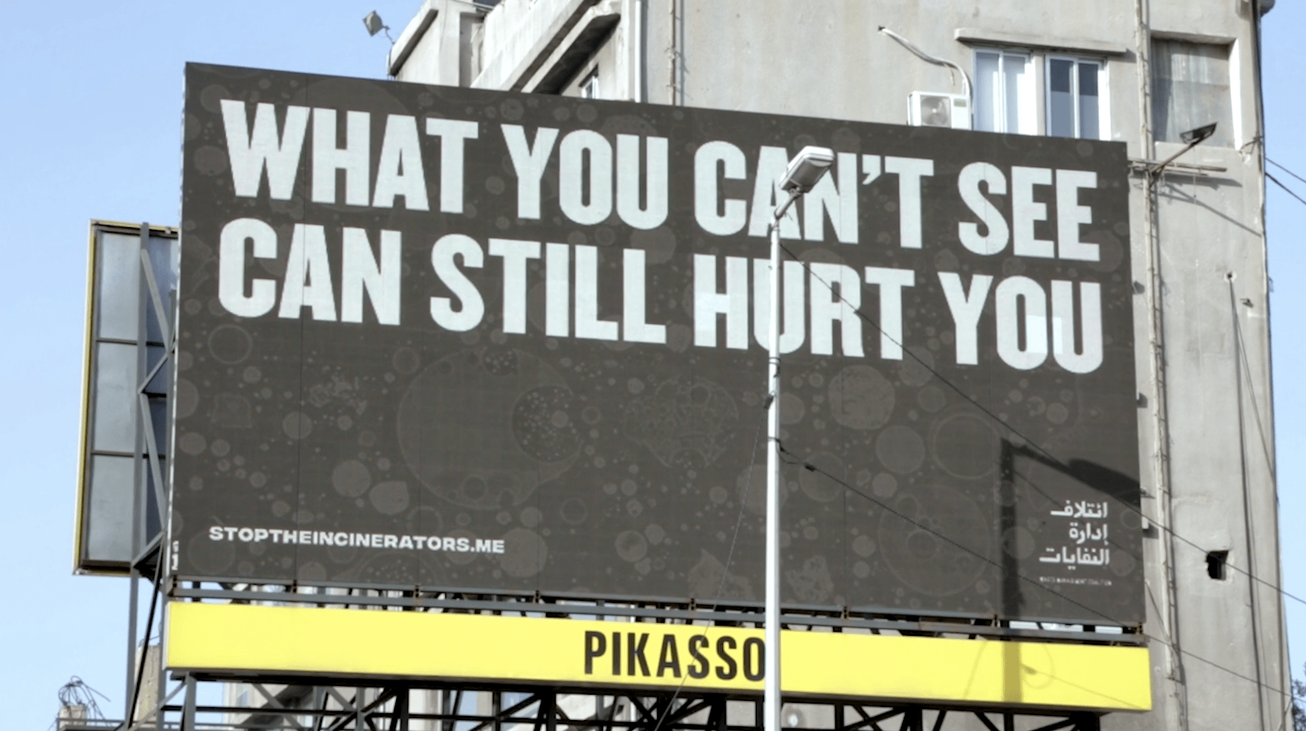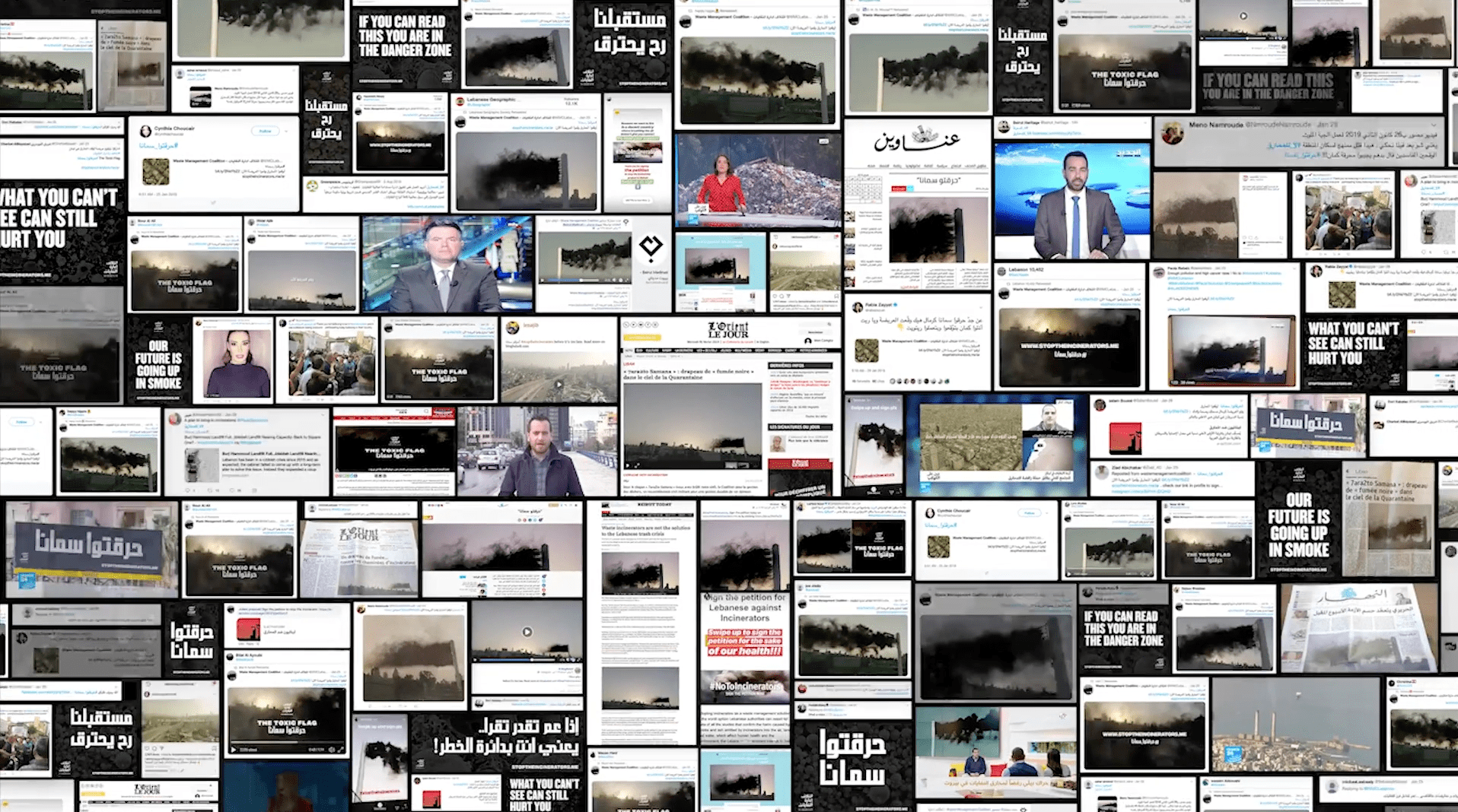 Make the invisible, visible คือคำบรรยายของแคมเปญ The Toxic Flag ซึ่งเป็น Installation Art ที่ได้แรงบันดาลใจจากเสาธงความสูง 12 เมตร ตั้งกลางเมืองหลวงอย่าง Beirut ทว่าสิ่งที่อยู่บนยอดเสาแทนที่จะเป็นผืนธงชาติเลบานอน กลับเป็นควันสีดำ (ที่สร้างโดยวัตถุดิบที่เป็นมิตรกับสิ่งแวดล้อม) พวยพุ่งออกมาตลอดเวลา คล้ายกับมลพิษจากเตาเผาขยะ ยืนตระหง่านเป็นสัญญาณเตือนสิ่งที่กำลังเกิดขึ้นกับประชาชน โดยเสาธง The Toxic Flag นี้ทำงานร่วมกับสื่ออื่นๆ ที่ช่วยสื่อสารแคมเปญไปพร้อมกัน เช่น บิลบอร์ดและเว็บไซต์ บัดนี้กองขยะที่รัฐบาลได้สะสมหมักหมมไว้ใต้พรมได้ถูกเปิดเผย
