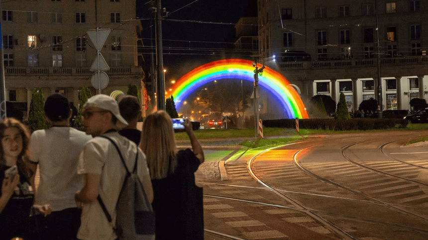 ทุกๆ ปี กลุ่มเพศหลากหลายในกรุงวอร์ซอว์ที่โปแลนด์จะสร้าง Installation Art ที่มีรูปทรงและสีสันเหมือนสายรุ้งเพื่อเป็นการเฉลิมฉลอง แต่ขณะเดียวกัน ประติมากรรมนี้ก็กลายเป็นเป้าหมายโจมตีจากกลุ่มเกลียดชังเพศที่สาม สายรุ้งถูกเผาทำลายในทุกปี เพราะกรุงวอร์ซอว์แห่งนี้ ได้ชื่อว่าเป็นเมืองที่ผู้คนเกลียดกลัวเกย์ที่สุดเมืองหนึ่งในยุโรป