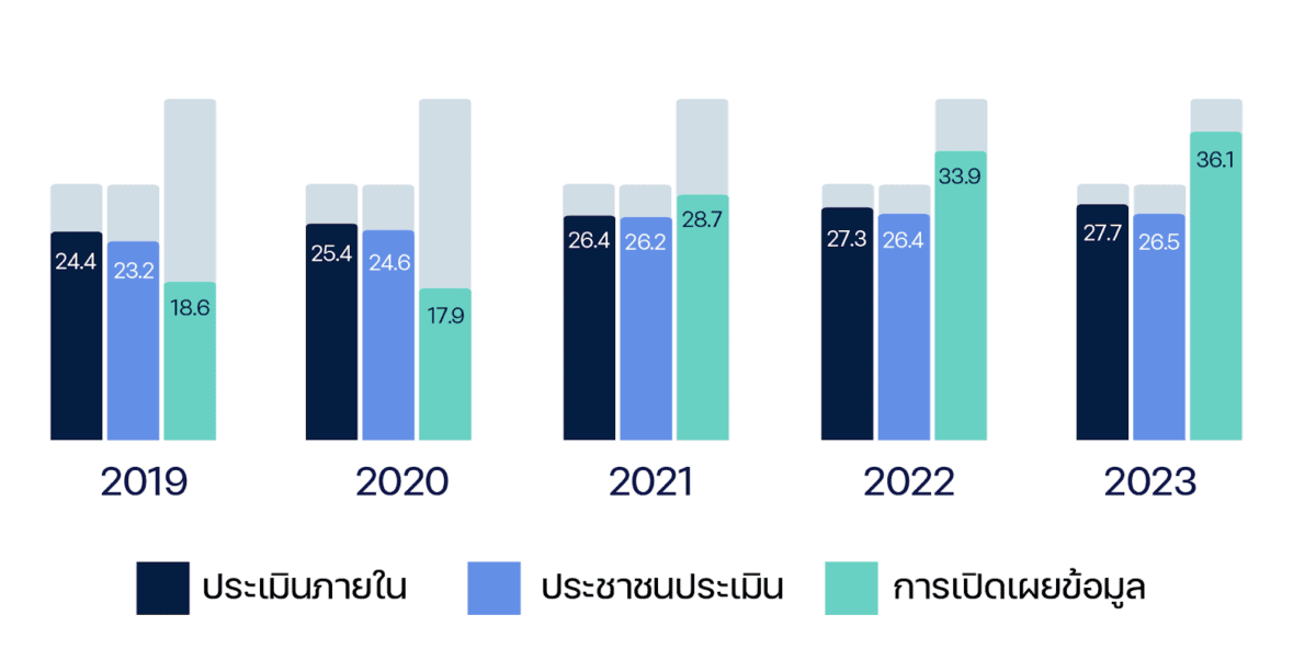 พิจารณาคะแนน ITA รายด้านย้อนหลังจะพบว่าคะแนนประเมินภายในและภายนอกเพิ่มขึ้นไม่มากนัก แต่คะแนนในส่วนการเปิดเผยข้อมูลเพิ่มขึ้นเกือบ 2 เท่าในห้วง 5 ปีที่ผ่านมา โดยหน่วยงานที่ได้คะแนนสูงมักได้คะแนนในส่วนนี้เต็ม 100 หรือเกือบเต็ม เนื่องจากเกณฑ์ในการวัดผลพิจารณาจากความสมบูรณ์ของเว็บไซต์เป็นสำคัญ เพียงแค่หน่วยงานส่งลิงก์ขององค์ประกอบต่างๆ ครบ 43 ข้อก็ได้คะแนนเต็มทันทีโดยไม่สนใจว่าข้อมูลเหล่านั้นจัดวางให้เข้าถึงได้ง่ายหรือไม่ รวมถึงมีประชาชนเข้าไปใช้งานจริงหรือไม่ ในทางกลับกันหน่วยงานที่ได้คะแนนลำดับท้ายๆ มักได้คะแนนในส่วนนี้เป็น 0 และโดยมากเป็นอปท.ซึ่งมีทรัพยากรในการจัดทำเว็บไซต์น้อยกว่าหน่วยงานส่วนกลาง