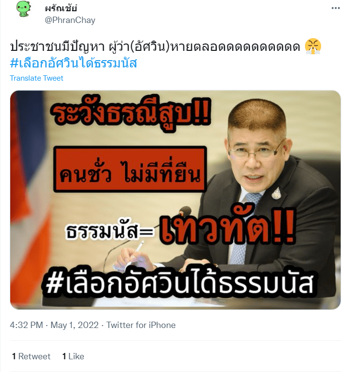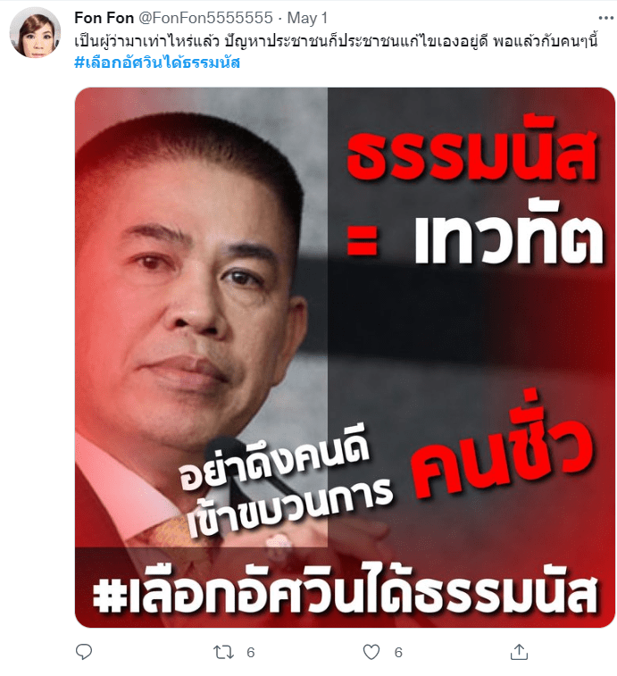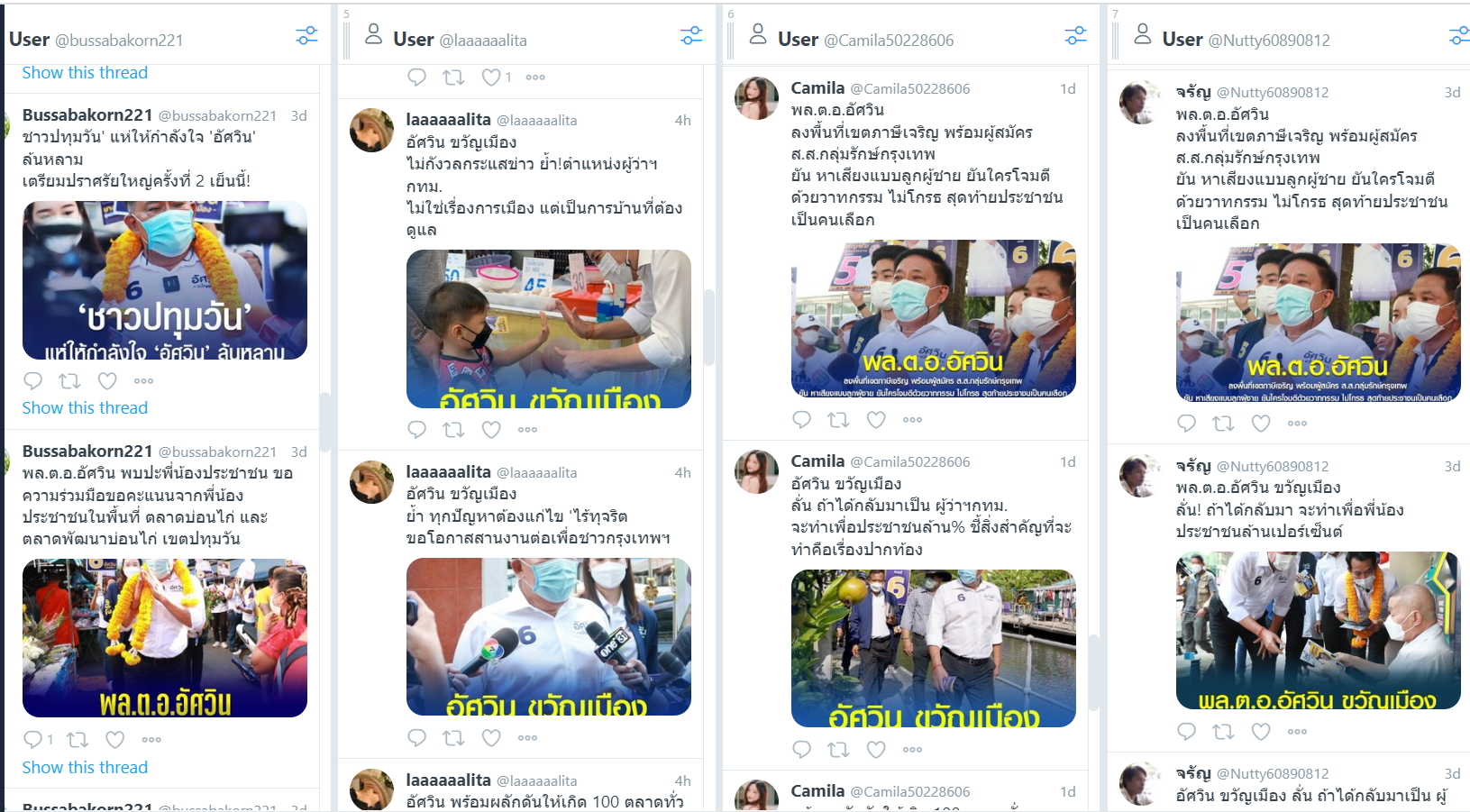 101 ยังพบว่า ตั้งแต่ต้นเดือนพฤษภาคมเป็นต้นมา บัญชีเหล่านี้ทยอยทวีตเนื้อหาโปรโมตหนึ่งในผู้สมัครอย่างอัศวิน ซึ่งมีทั้งเรื่องการลงพื้นที่พบปะพี่น้องประชาชนระหว่างหาเสียง ผลงานในสมัยเป็นผู้ว่าฯ รวมถึงโควตคำพูดเด็ดจากการให้สัมภาษณ์กับสำนักข่าว โดยมีข้อสังเกตคือหลายทวีตใช้ภาพประกอบและข้อความซ้ำกัน แม้จะทวีตคนละวันและเวลากันก็ตาม