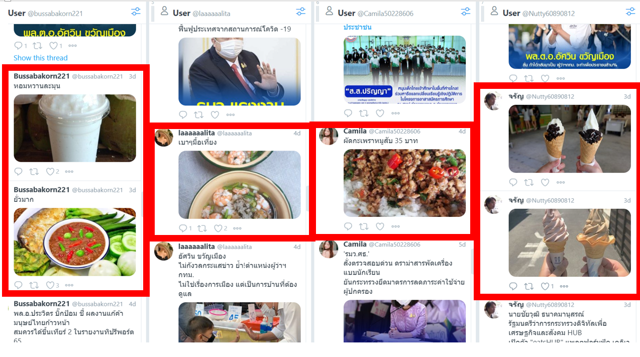 ภาพ 12: หน้ากิจกรรมของบัญชีตัวอย่าง 4 บัญชีในเครือข่าย 14 บัญชี ที่พบว่ามักจะโพสต์ภาพอาหารแทรก (ภาพจากเครื่องมือ tweetdeck.twitter.com)