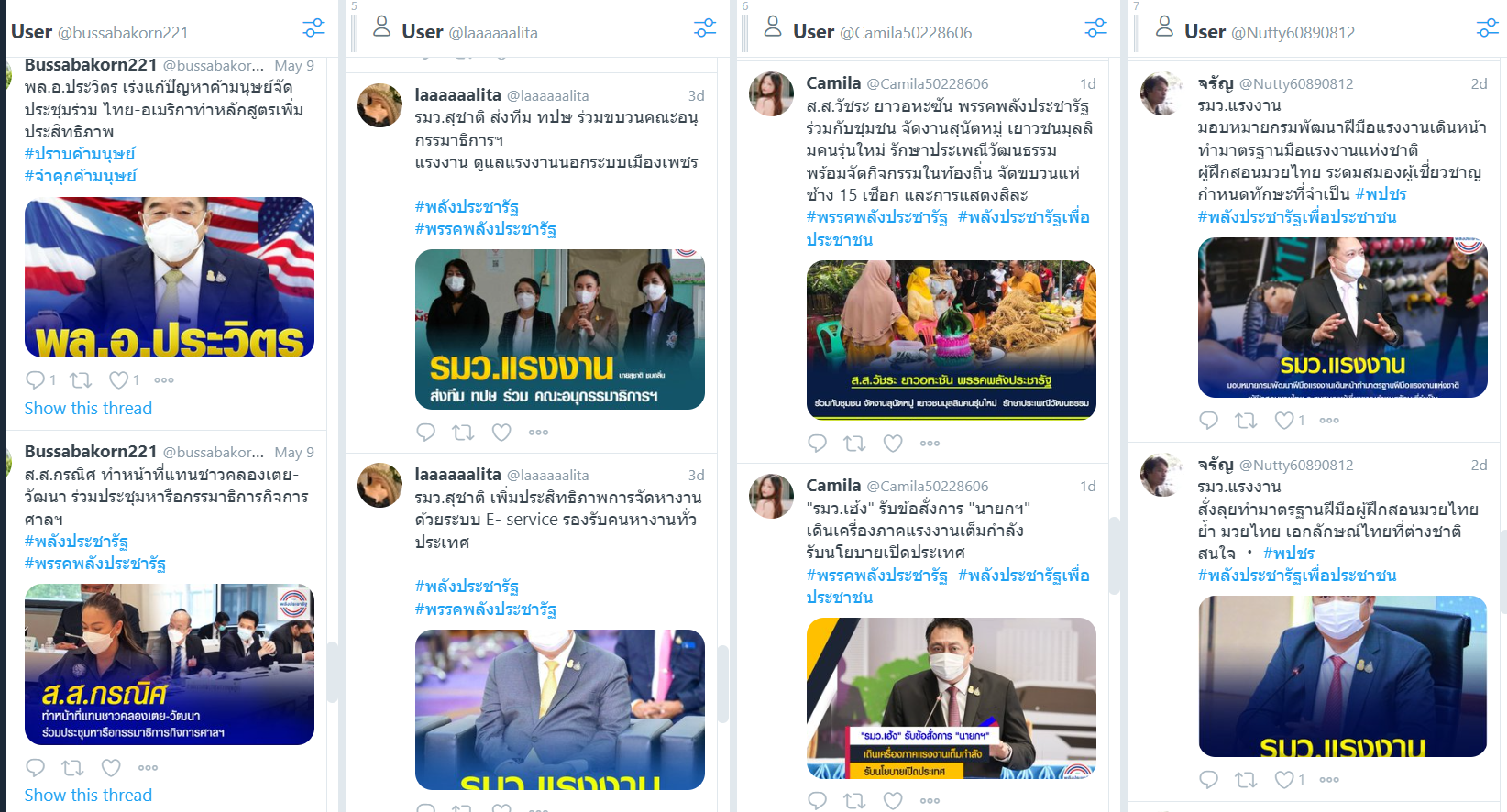ภาพ 10: หน้ากิจกรรมของบัญชีตัวอย่าง 4 บัญชีในเครือข่าย 14 บัญชี ที่มักทวีตเนื้อหาเกี่ยวกับประวิตรและพรรคพลังประชารัฐ (ภาพจากเครื่องมือ tweetdeck.twitter.com)