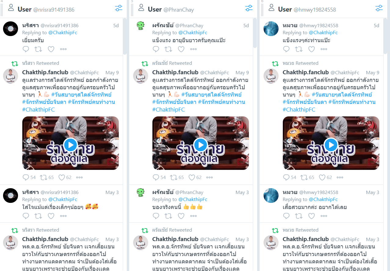 ภาพ 9: หน้ากิจกรรมของบัญชีตัวอย่าง 3 บัญชีในเครือข่าย 51 บัญชี ที่ปรากฏว่าล้วนมีการรีทวีตและรีพลายจากบัญชี ‘จักรทิพย์คนทำงาน’ ( (ภาพจากเครื่องมือ tweetdeck.twitter.com)