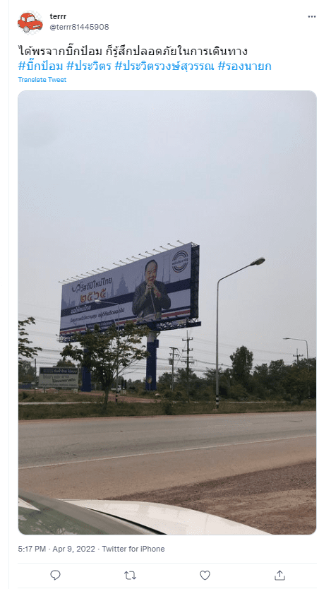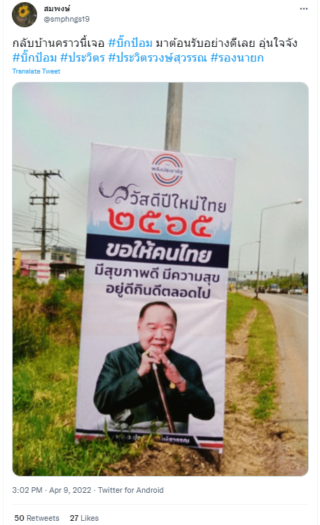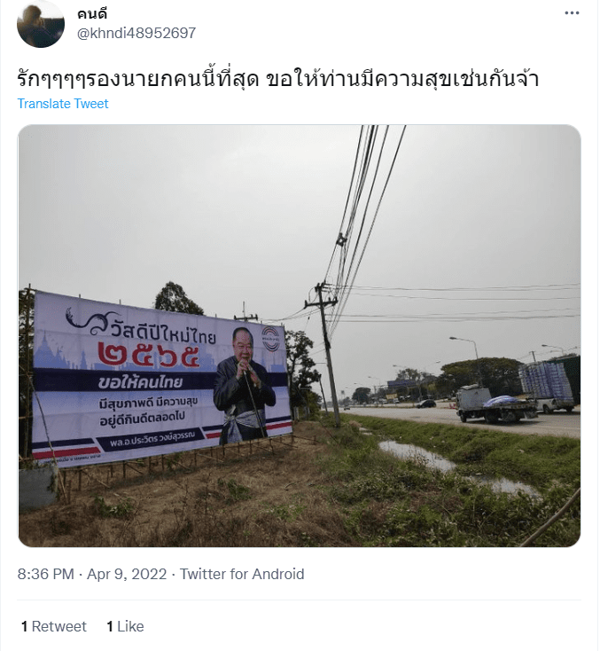 1. วันที่ 9 เมษายน ซึ่งเป็นวันที่บัญชีส่วนใหญ่ในกลุ่มนี้ถูกสร้างขึ้น ปรากฏทวีตและรีทวีตภาพถ่ายป้ายอวยพรวันสงกรานต์ตามถนนทางหลวง ของรองนายกรัฐมนตรีและหัวหน้าพรรคพลังประชารัฐ พล.อ. ประวิตร วงษ์สุวรรณ โดยมีรูปภาพหลากหลาย พร้อมด้วยแคปชันที่เป็นการอวยพรหรือชื่นชมประวิตร ตามด้วยแฮชแท็ก #บิ๊กป้อม #ประวิตร #ประวิตรวงษ์สุวรรณ #รองนายก