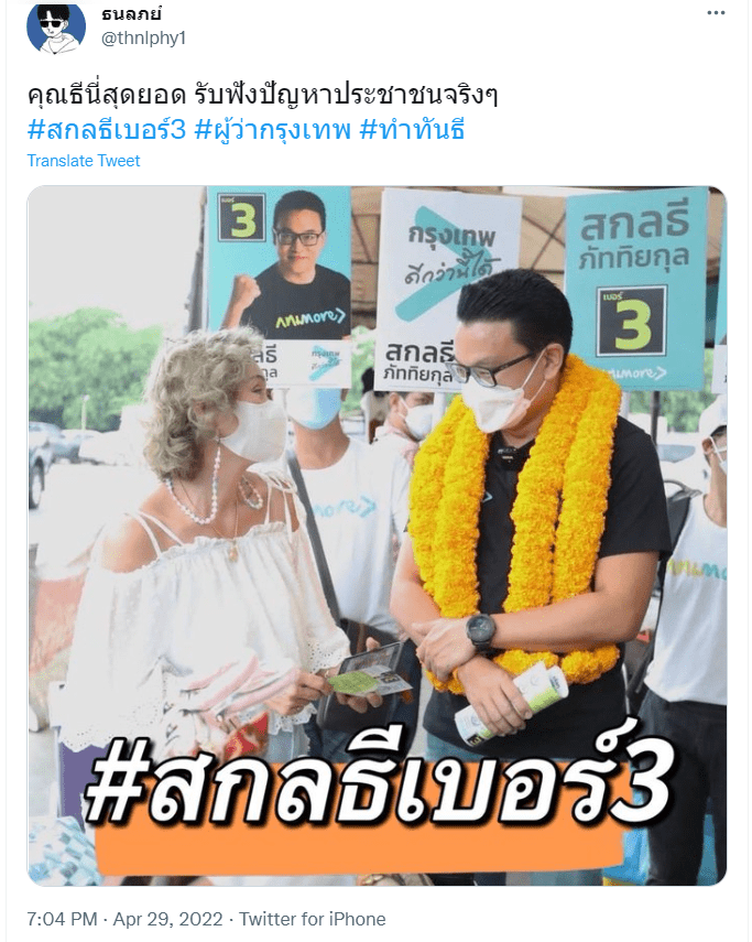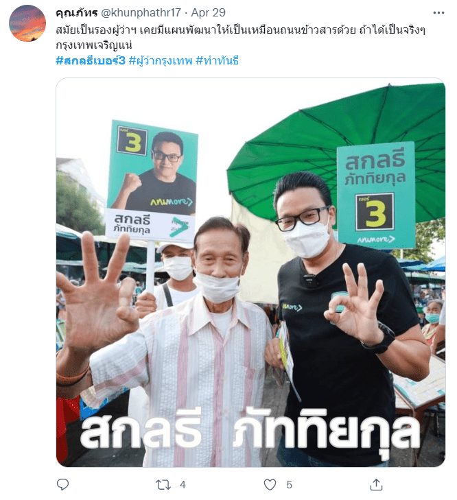 ก่อนหน้าการเคลื่อนไหวในแฮชแท็ก #เลือกอัศวินได้ธรรมนัส ได้ 2 วัน คือวันที่ 29 เมษายนที่ผ่านมา 101 ก็สังเกตพบอีกความเคลื่อนไหวที่เกี่ยวกับการเลือกตั้งผู้ว่าฯ ของ 51 บัญชีกลุ่มนี้ โดยเป็นทวีตเชียร์ผู้สมัครหมายเลข 3 อย่างสกลธี ซึ่งเกิดขึ้นภายในวันเดียวกัน โดยมีข้อความแตกต่างกันไป แต่ที่เหมือนกันคือล้วนติดแฮชแท็ก #สกลธีเบอร์3 #ผู้ว่ากรุงเทพ และ #ทำทันธี