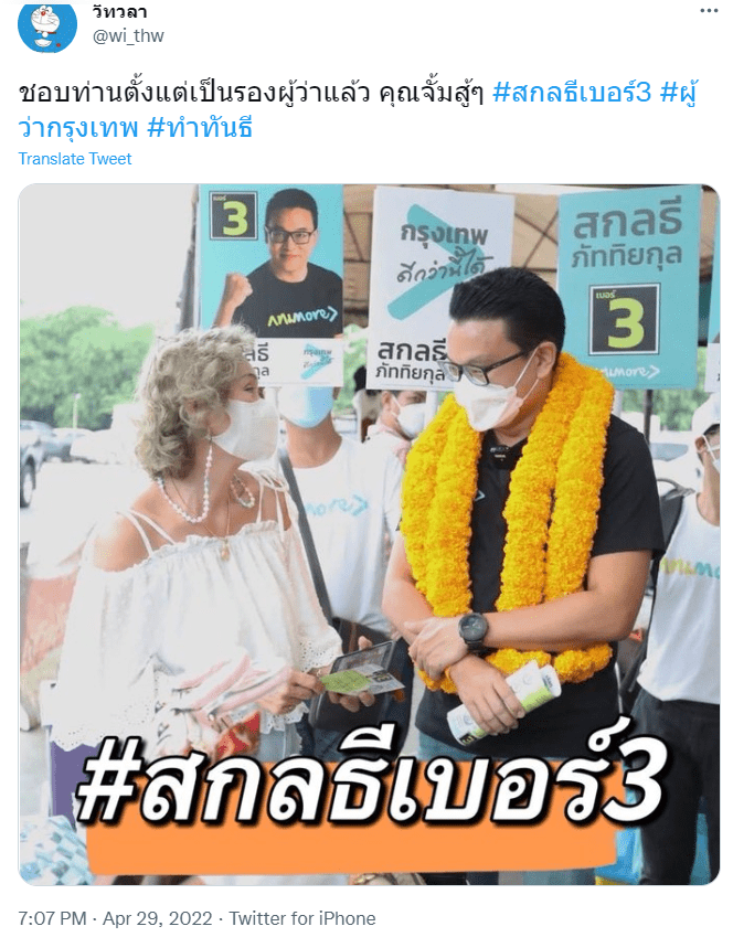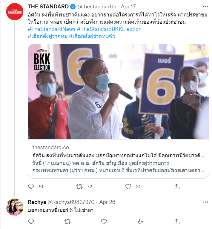 ภาพ 1: ทวีตลิงก์ข่าวเกี่ยวกับผู้สมัครผู้ว่ากรุงเทพฯ เบอร์ 3 (สกลธี ภัททิยกุล) แต่กลับปรากฏรีพลายโจมตีผู้สมัครเบอร์ 8 (ชัชชาติ สิทธิพันธุ์) ตามตัวอย่าง