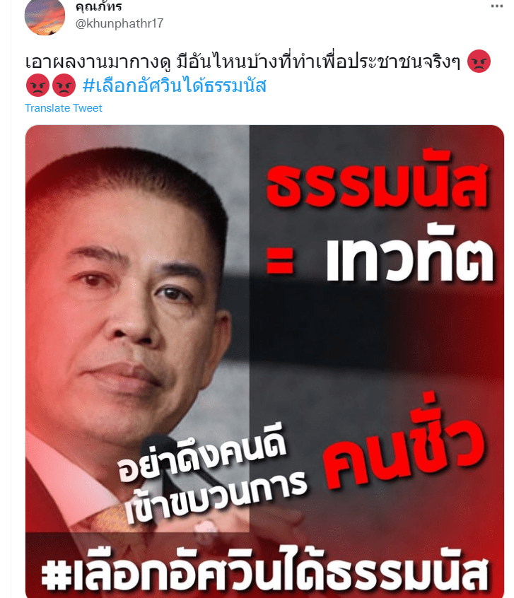 ท่ามกลางการเคลื่อนไหวของทั้ง 382 บัญชีทวิตเตอร์ หนึ่งความเคลื่อนไหวที่สะดุดตาที่สุดคือหลายบัญชีในกลุ่มนี้โควตทวีต รวมถึงรีพลายจากทวีตหนึ่ง ซึ่งระบุข้อความว่า “กระจ่าง #เลือกอัศวินได้ธรรมนัส” พร้อมแนบภาพประกอบซึ่งแคป (capture) มาจากกล่องความคิดเห็นหนึ่งบนเว็บบอร์ดของเว็บไซต์ Pantip.com โดยเป็นภาพการโยงใยสายสัมพันธ์ระหว่างอัศวินและ ร.อ. ธรรมนัส พรหมเผ่า เลขาธิการพรรคเศรษฐกิจไทย และอดีตรัฐมนตรีช่วยในรัฐบาล พล.อ.ประยุทธ์ จันทร์โอชา ซึ่งตกเป็นประเด็นฉาวหลายเรื่อง ภาพดังกล่าวมีเนื้อหาที่ชัดเจนว่าเป็นผลลบต่อภาพลักษณ์ของอัศวิน และยังไม่มีการพิสูจน์แน่ชัดว่าข้อมูลในภาพนั้นจริงหรือเท็จประการใดบ้าง