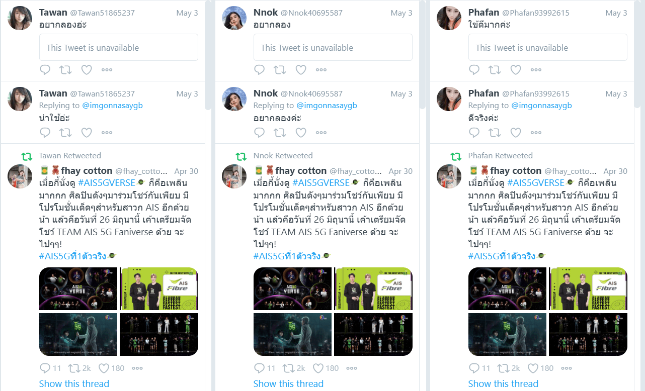 4. บนหน้ากิจกรรมมักมีการรีทวีต (retweet) หรือรีพลายข้อความที่เหมือนกัน ในเวลาไล่เลี่ยกัน ซึ่งมักเป็นข้อความประเภทรีวิวสินค้า โฆษณา เว็บพนันออนไลน์ สลากออนไลน์ กิจกรรมร่วมสนุกชิงรางวัล ทวีตเกี่ยวกับดารานักร้อง รวมถึงคลิปลามกอนาจาร