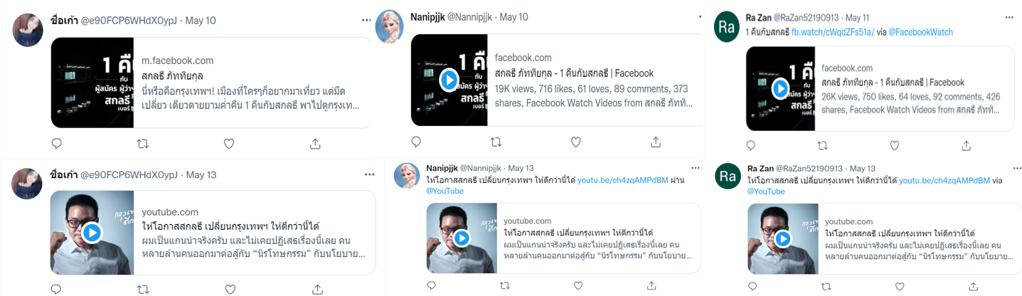 หลังจากที่ความเคลื่อนไหวคึกคักมากในช่วง 26-27 เมษายน บัญชีเหล่านี้แทบไม่มีการเคลื่อนไหวในเนื้อหาที่เกี่ยวข้องกับการเลือกตั้งผู้ว่าฯ อีก จนกระทั่งเข้าสู่วันที่ 10-11 พฤษภาคม เราถึงได้เริ่มเห็นความเคลื่อนไหวใหม่ นั่นคือการทวีตลิงก์วิดีโอหาเสียงของผู้สมัครเบอร์ 3 สกลธี ภัททิยกุล ในหัวข้อ ‘1 คืนกับสกลธี’ ตามด้วยวันที่ 13 พฤษภาคม ที่มีการทวีตคลิป ‘ให้โอกาสสกลธี เปลี่ยนกรุงเทพฯ ให้ดีกว่านี้ได้’ โดยในการทวีตทั้งสองคลิปของแต่ละบัญชีเกิดขึ้นในเวลาไล่เลี่ยกัน