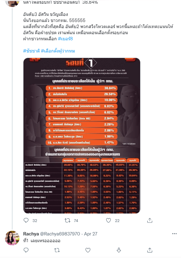 ในระหว่างการสืบเสาะประวัติการทวีตและรีพลายของบัญชีทวิตเตอร์ต้องสงสัยเหล่านั้น ก็เจอเรื่องน่าแปลกใจว่า บัญชีเหล่านั้นไม่ได้โจมตีเพียงชัชชาติ แต่ยังพุ่งโจมตีตรงไปที่ผู้สมัครเบอร์ 6 อย่าง พล.ต.อ. อัศวิน ขวัญเมือง อดีตผู้ว่ากรุงเทพฯ ไปควบคู่กัน ด้วยรูปแบบปฏิบัติการที่คล้ายกัน นั่นคือการเข้าไปถล่มรีพลายในเวลาไล่เลี่ยกัน โดยเกิดขึ้นในช่วงระหว่างวันที่ 26-27 เมษายน พร้อมๆ กับการโจมตีชัชชาติ