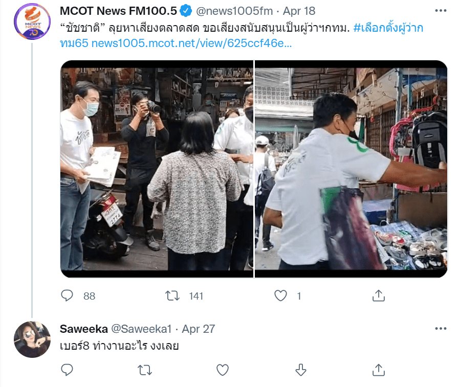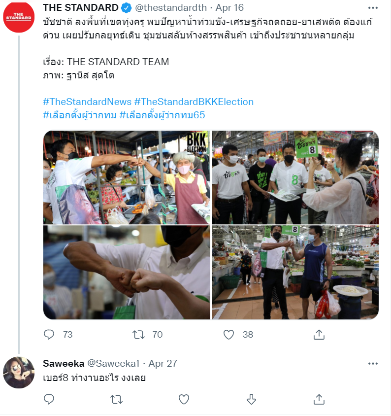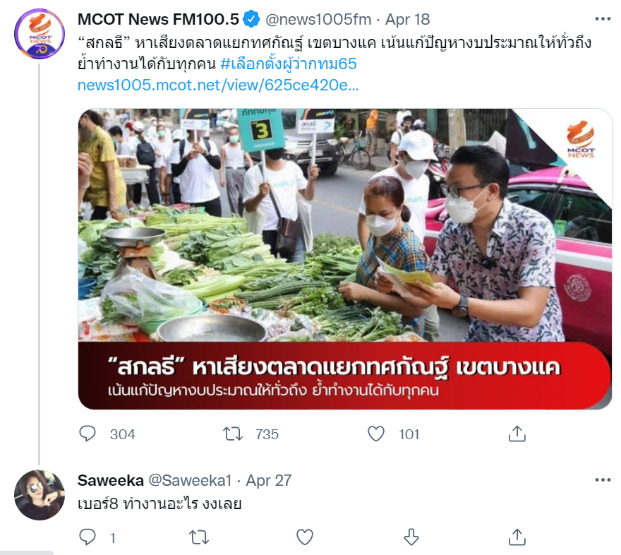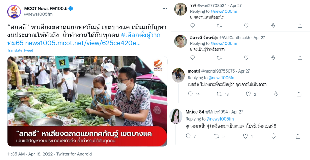 วันที่ 26-27 เมษายนที่ผ่านมา ข้อความเหล่านี้ปรากฏขึ้นบนทวิตเตอร์ (Twitter) โดยเป็นข้อความรีพลาย (reply – ตอบกลับ) ของทวีต (tweet) ลิงก์ข่าวหนึ่งที่เกี่ยวกับการหาเสียงเลือกตั้งผู้ว่ากรุงเทพฯ แต่ข้อความพวกนี้กลับสร้างเสียงหัวเราะให้ชาวโซเชียลไม่น้อย เมื่อเลื่อนขึ้นไปเห็นว่าลิงก์ข่าวนั้นไม่ได้มีเนื้อหาเกี่ยวข้องใดๆ เลยกับผู้สมัครหมายเลข 8 คือชัชชาติ สิทธิพันธุ์ แต่เป็นข่าวการหาเสียงของผู้สมัครหมายเลข 3 คือสกลธี ภัททิยกุล
