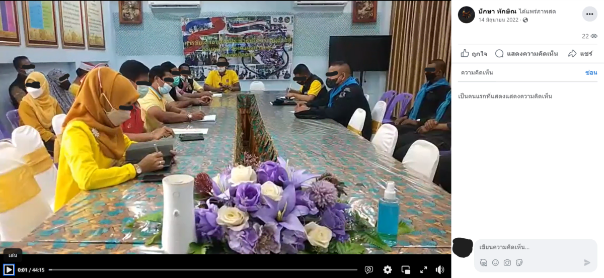 จากนั้นเมื่อเราลองฟังบทสนทนาในคลิป ก็พอจับใจความได้คร่าวๆ ว่าเป็นการรายงานความคืบหน้าในการดำเนินงานหลายเรื่องในพื้นที่ และได้ยินว่าผู้เข้าร่วมประชุมในขณะนั้นมีทั้งบุคคลที่เป็น นายก อบต., ผู้ใหญ่บ้าน, หัวหน้าส่วนราชการของบางหน่วยงาน, สมาชิกสภาประชาธิปไตยระดับตำบล และกรมทหารพรานที่ 44 นอกจากนี้เมื่อสังเกตที่เสื้อของผู้ร่วมประชุมบางคนก็พบข้อความระบุว่า ‘กรมการปกครอง’ ซึ่งอยู่ภายใต้กระทรวงมหาดไทย