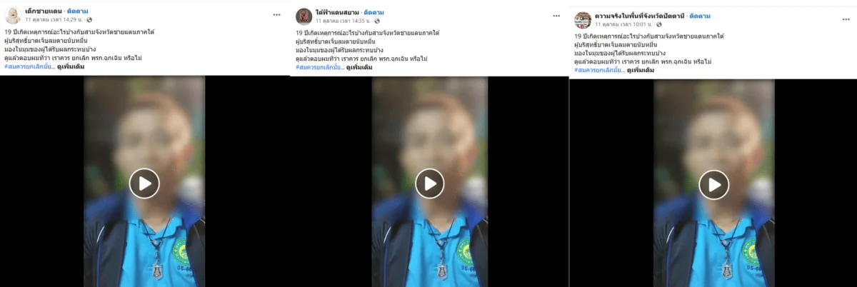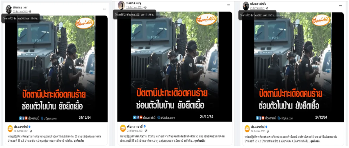 ภาพ 3: ตัวอย่างโพสต์คลิปวิดีโอที่เผยแพร่โดยหลายแฟนเพจในเวลาไล่เลี่ยกัน พร้อมแคปชันข้อความที่เหมือนกัน