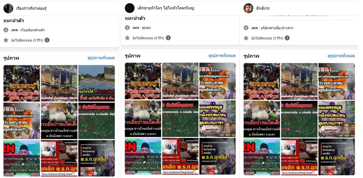 จากการเข้าไปสำรวจหน้าบัญชีของทั้ง 24 บัญชีผู้ใช้ เรามีข้อสังเกตว่าทุกบัญชีไม่มีการเปิดเผยตัวตนที่แท้จริงของตัวเอง เห็นได้ชัดเจนจากภาพโปรไฟล์ที่มักใช้ภาพสัตว์บ้าง ตัวการ์ตูนบ้าง สถานที่ท่องเที่ยวบ้าง หรือหากเป็นภาพคนก็เป็นภาพที่ไม่เห็นใบหน้า หรือหากเห็นใบหน้าชัดเจน ก็ดูออกได้ง่ายว่าเป็นภาพที่นำมาจากแหล่งอื่น ขณะที่ภาพโปรไฟล์ของบางบัญชีผู้ใช้ก็มีลักษณะที่คล้ายกันมาก และเมื่อดูที่ประวัติการเผยแพร่ข้อความของแต่ละบัญชี ก็เห็นได้ว่าเกือบทั้งหมดเป็นการแชร์โพสต์จากแฟนเพจต่างๆ ซึ่งล้วนเป็นโพสต์ที่มีเนื้อหาเกี่ยวกับสามจังหวัดชายแดนภาคใต้ โดยเฉพาะการโจมตีผู้ก่อความไม่สงบและนักเคลื่อนไหวในพื้นที่ โดยแทบไม่มีการโพสต์ข้อความอื่นใด เสมือนว่าจงใจสร้างบัญชีขึ้นมาเพื่อแชร์เนื้อหาเหล่านี้โดยเฉพาะ