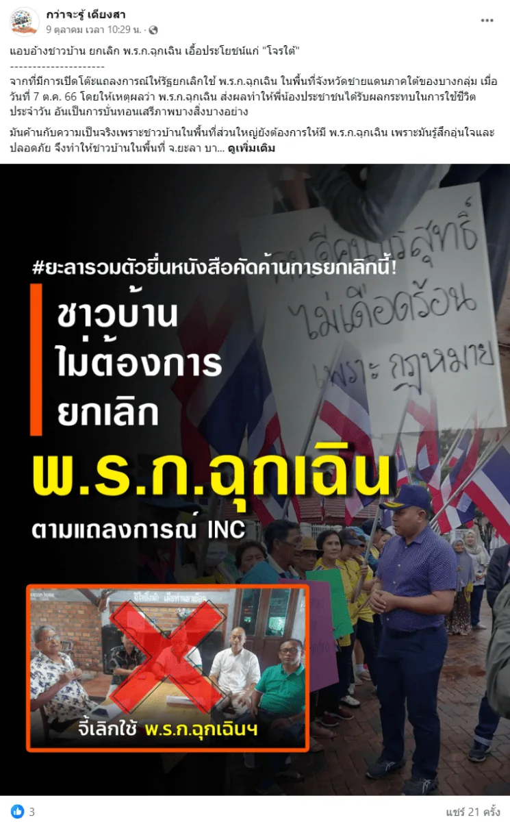 ภาพ 1: ตัวอย่างโพสต์คลิปวิดีโอสัมภาษณ์คนในพื้นที่สามจังหวัดชายแดนภาคใต้ที่ไม่อยากให้ยกเลิก พ.ร.ก.ฉุกเฉิน จากแฟนเพจ ‘กว่าจะรู้ เดียงสา‘