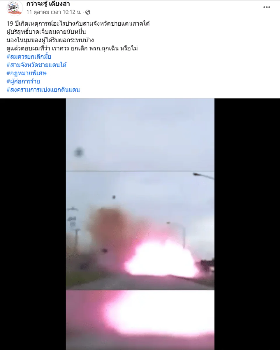 จากการเฝ้าติดตามแฟนเพจ ‘กว่าจะรู้เดียงสา’ เราพบความเคลื่อนไหวน่าสนใจหนึ่งที่เกิดขึ้นนับตั้งแต่วันที่ 11 ตุลาคมที่ผ่านมา โดยมีการโพสต์คลิปวิดีโอสัมภาษณ์ชาวบ้านในพื้นที่สามจังหวัดชายแดนภาคใต้ ที่ส่งเสียงสะท้อนว่าไม่ต้องการให้ยกเลิก พ.ร.ก.ฉุกเฉิน (พระราชกำหนดการบริหารราชการในสถานการณ์ฉุกเฉิน พ.ศ. 2548) ที่บังคับใช้ในพื้นที่สามจังหวัดชายแดนภาคใต้มาต่อเนื่องกันนานกว่า 18 ปี