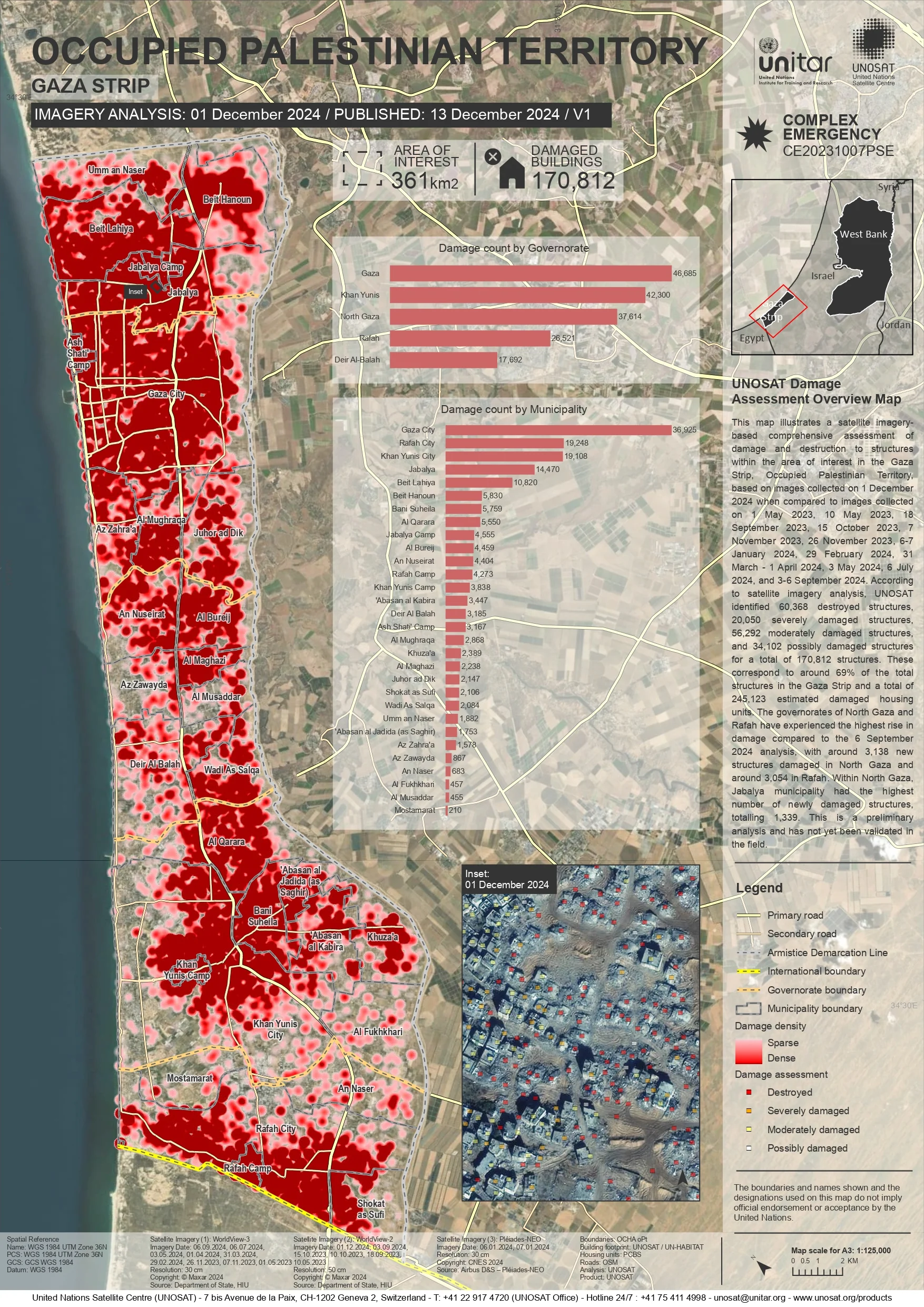 นอกจากความเสียหายต่อชีวิตผู้คนแล้ว อาคารและทรัพย์สินในกาซาก็ถูกทำลายอย่างย่อยยับเช่นกัน โดยศูนย์ดาวเทียมแห่งสหประชาชาติ (UNOSAT) ได้ทำการสำรวจสภาพความเสียหายของพื้นที่กาซาผ่านภาพถ่ายดาวเทียมล่าสุดในวันที่ 1 ธันวาคม 2024 พบว่ามีอาคารบ้านเรือนได้รับผลกระทบรวมกันถึง 170,812 อาคาร คิดเป็นร้อยละ 69 ของอาคารทั้งหมดในฉนวนกาซา โดยในจำนวนนี้เป็นอาคารที่ถูกทำลายอย่างราบคาบถึง 60,368 อาคาร และมีอาคารที่เสียหายอย่างรุนแรง 20,050 อาคาร