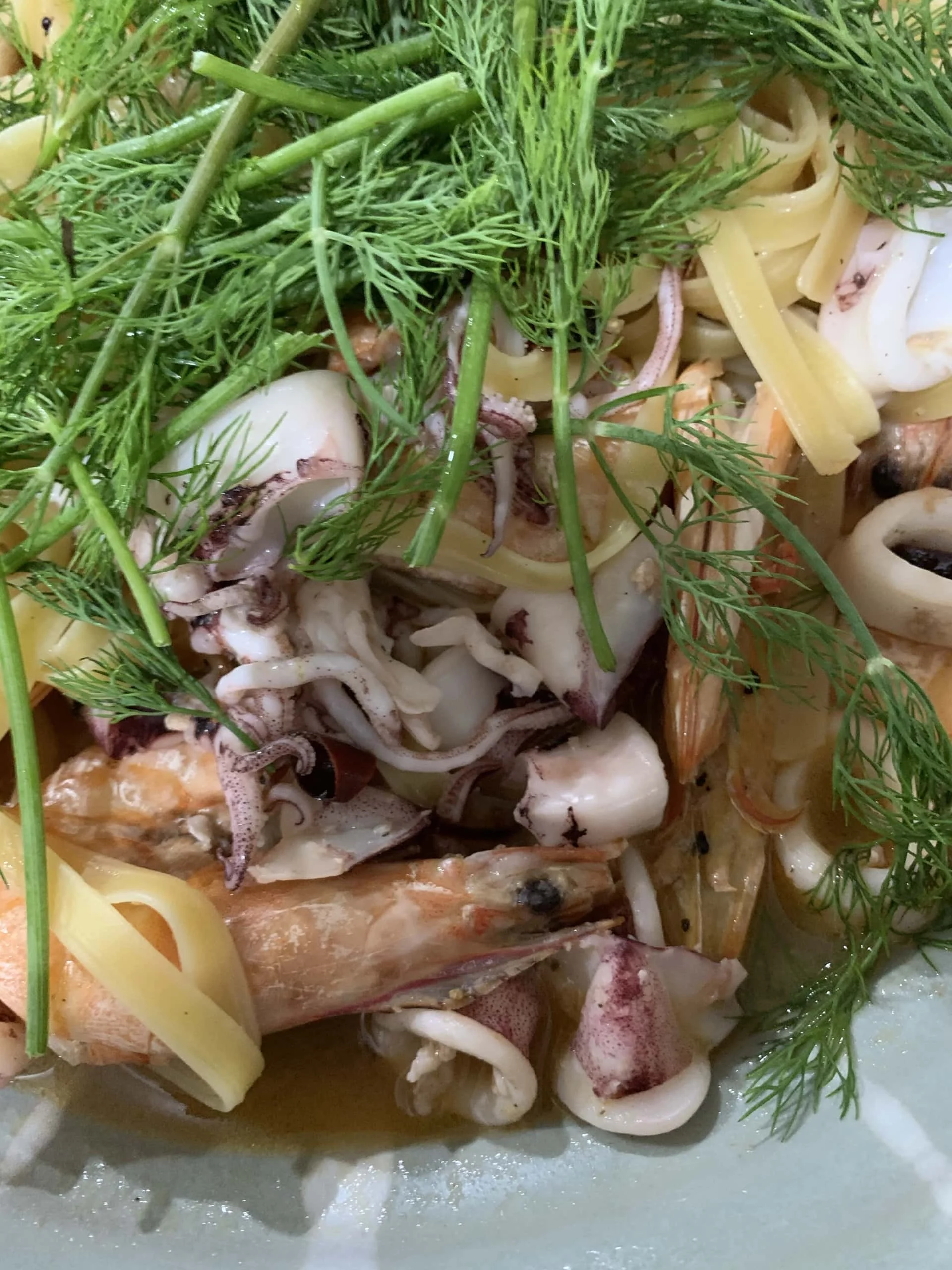 เป็นอาหารจานด่วนที่ฟุ้งไปด้วยอะโรมาของทะเล กลิ่นซิตรัสสดชื่น กุ้งหวานเจี๊ยบเพราะสดมาก ปลาหมึกกรุบๆ และสิ่งที่อร่อยที่สุดของอาหารจานนี้คือความสบาย เป็นกลิ่นและรสของความ carefree ภาวะปลอดทุกข์ปลอดห่วง ปลอดความกังวล เหมือนได้นุ่งกระโปรงบานๆ บางๆ ไม่ต้องใส่กางเกงในแล้วเดินอยู่บนชายหาดยามเย็น