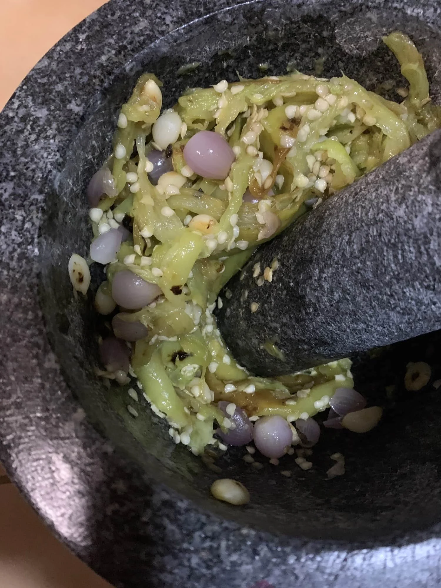 ถ้าเราเพิ่มมะเขือยาวเผาลงไปเราจะได้ตำมะเขือ กินคู่กับแคบหมู ไข่ต้ม สะระแหน่ อร่อยที่สุด