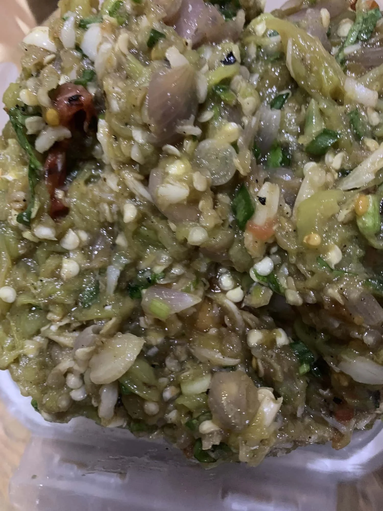 ย่างทุกอย่างสุกๆ หอมๆ ร้อนๆ รีบแกะเปลือกทุกอย่างออก ให้เหลือแต่เนื้อในนุ่มๆ นำทุกอย่างลงครกแล้วโขลกแค่พอให้ทุกอย่างผสานเข้าไป ฉันอยากจะใช้คำว่า ‘ตำพอโผละเผละ’ ไม่ใช่การตั้งหน้าตั้งตาโขลกทุกอย่างให้ละเอียด จากนั้นปรุงรสด้วยเกลือหรือน้ำปลา ผงชูรส ที่ขาดไม่ได้คือ ต้นหอม ผักชีต้องเยอะ ความเลิศเลอของน้ำพริกชนิดนี้คือรสชาติหวานอมเปรี้ยว และอูมามิธรรมชาติจากมะเขือเทศ ผสานไปกับอูมามิของปลาร้าหมกไฟในใบตองหอมๆ มันคือที่สุดของที่สุดของที่สุดในกลุ่มตระกูลน้ำพริกหนุ่ม