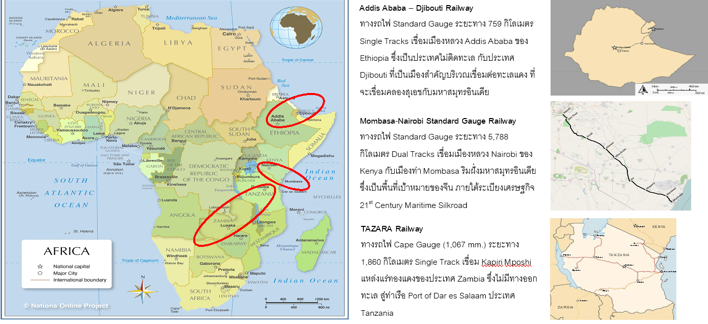 เส้นทางรถไฟที่สร้างโดยจีนในแอฟริกาทั้ง 3 เส้นได้แก่ TAZARA Railway, Addis Ababa–Djibouti Railway และ Mombasa–Nairobi Standard Gauge Railway