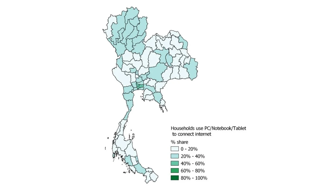สำหรับการเชื่อมต่ออินเตอร์เน็ตโดยใช้คอมพิวเตอร์แบบ PC/notebook/tablet มีเพียงครัวเรือนในกรุงเทพมหานครและนนทบุรีที่มีการเชื่อมต่ออินเทอร์เน็ตโดยใช้คอมพิวเตอร์ ร้อยละ 55 และ 43 ตามลำดับ จังหวัดอื่นๆ มีสัดส่วนครัวเรือนที่มีการเชื่อมต่อโดยใช้คอมพิวเตอร์ไม่เกินร้อยละ 40 (ดูรูป 3) ตัวเลขเหล่านี้สะท้อนให้เห็นถึงความเหลื่อมล้ำที่อาจเกิดจากการเรียนออนไลน์ ซึ่งจะซ้ำเติมปัญหาความเหลื่อมล้ำทางการศึกษาที่มีอยู่เดิม