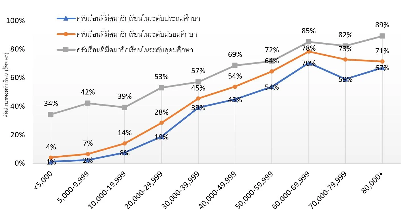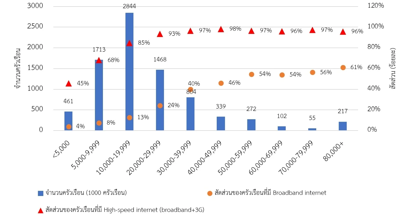 จากข้อมูลสำรวจการมีการใช้เทคโนโลยีสารสนเทศของครัวเรือนในปี พ.ศ. 2561[3] ครัวเรือนไทยที่มีเด็กอยู่ในวัยเรียนมีทั้งหมด 8.28 ล้านครัวเรือน ในจำนวนนี้กว่า 6 ล้านครัวเรือนมีการเชื่อมต่ออินเทอร์เน็ตความเร็วสูง (อินเทอร์เน็ตแบบ broadband และอินเทอร์เน็ตที่เชื่อมต่อผ่านมือถือ เช่น 3G) แต่ส่วนใหญ่จะเป็นการเชื่อมต่อผ่านมือถือ โดยในกลุ่มครัวเรือนที่มีรายได้ต่ำกว่า 20,000 บาท (5 ล้านครัวเรือน) ครัวเรือนที่เชื่อมต่ออินเตอร์เน็ต broadband มีสัดส่วนเพียงไม่เกินร้อยละ 20 ของครัวเรือนในกลุ่มรายได้เดียวกัน เปรียบเทียบกับกลุ่มครัวเรือนที่มีรายได้ตั้งแต่ 50,000 บาทต่อเดือนขึ้นไป (6.46 แสนครัวเรือน) ที่มีสัดส่วนการเข้าถึงอินเตอร์เน็ต broadband มากกว่าร้อยละ 50 (ดูรูป 1)