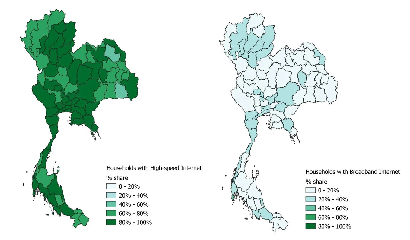 ในรายจังหวัด ครัวเรือนกว่าร้อยละ 60 มีการเชื่อมต่ออินเทอร์เน็ตความเร็วสูงแต่ส่วนใหญ่เป็นการเชื่อมต่อผ่านมือถือ มีเพียงจังหวัดสกลนครและศรีสะเกษที่มีสัดส่วนครัวเรือนมีการเชื่อมต่ออินเทอร์เน็ตความเร็วสูงน้อยกว่าร้อยละ 60 ส่วนครัวเรือนที่มีการเชื่อมต่ออินเทอร์เน็ตแบบ broadband จะกระจุกตัวอยู่ตามเมืองใหญ่ เช่นในภาคตะวันออกเฉียงเหนือ มีเพียงจังหวัดนครราชสีมา มหาสารคาม และนครพนมที่มีสัดส่วนครัวเรือนที่มีการเชื่อมต่ออินเทอร์เน็ตแบบ broadband มากกว่าร้อยละ 20 ของครัวเรือนในจังหวัดนั้น (ดูรูป 2)