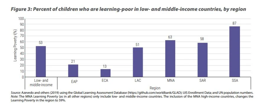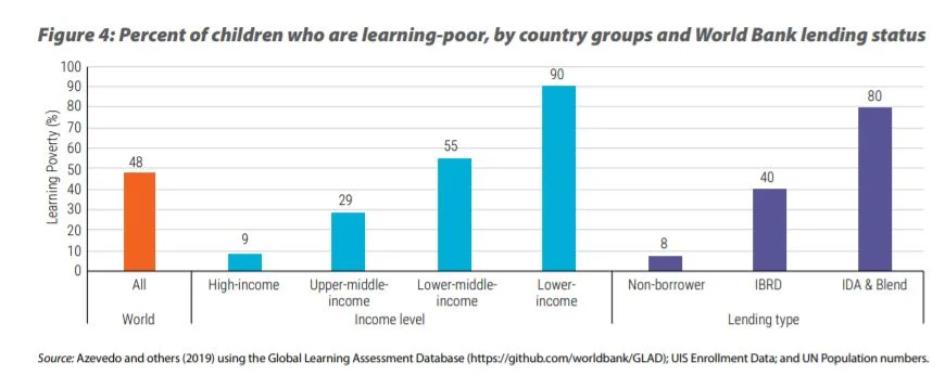 ปัจจุบัน เด็กในกลุ่มประเทศรายได้ปานกลางต่ำกว่าร้อยละ 53 ไม่สามารถอ่านออกเขียนได้อย่างเหมาะสมเมื่อมีอายุ 10 ปี หากโลกทั้งใบถูกย่อส่วนเป็นห้องเรียนห้องหนึ่งที่มีนักเรียนราว 40 คน ก็จะมีนักเรียนถึง 22 คนในห้องนี้ที่ขาดทักษะการอ่าน ซึ่งจะฉุดรั้งทักษะการคิดวิเคราะห์และลดทอนความเข้าใจแนวคิดที่เป็นนามธรรม ยิ่งไปกว่านั้น ร้อยละ 53 ที่ว่านี้ยังถูกฉุดขึ้นมากแล้วด้วยอัตราการรู้หนังสือของเด็กในประเทศรายได้ปานกลางค่อนสูง หากตัดประเทศกลุ่มนี้ออก อัตราดังกล่าวจะสูงขึ้นถึงมากกว่าร้อยละ 80 ในกลุ่มประเทศรายได้ปานกลางค่อนต่ำ