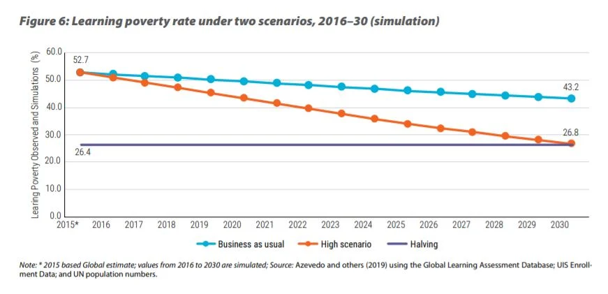 โดยเป้าหมายที่ธนาคารโลกเสนอให้กลุ่มประเทศรายได้ปานกลางและต่ำนำไปพัฒนาต่อไป คือ “การลดจำนวนเด็กอายุ 10 ปีที่ยังไม่สามารถอ่านออกเขียนได้อย่างเหมาะสมลงครึ่งหนึ่งของจำนวนที่มีอยู่ในปัจจุบันภายในปี 2030 ผ่านการยกระดับระบบการศึกษาทั้งระบบ”