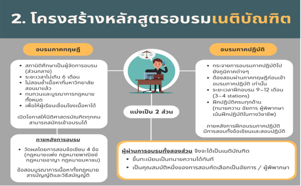 1) การอบรมภาคทฤษฎี การอบรมในส่วนนี้จะเปิดโอกาสให้นิติศาสตรบัณฑิตทุกท่านที่สำเร็จการศึกษาจากหลักสูตรที่ผ่านมาตรฐานหลักสูตรที่สภานิติศึกษากำหนดสามารถเข้าอบรมได้ โดยจะมีการอบรมในระยะเวลาไม่เกิน 6 เดือน และจะไม่มีการอบรมแยกตามรายวิชาอย่างที่เป็นอยู่ในปัจจุบัน แต่จะเป็นการสอนในเชิงบูรณาการกฎหมายที่หลากหลายเพื่อให้ผู้เรียนเชื่อมโยงเนื้อหากฎหมายได้ รวมทั้งการอบรมที่เน้นความรู้ในทางปฏิบัติเพื่อเตรียมความพร้อมสำหรับการอบรมในภาคปฏิบัติ และเมื่ออบรมเสร็จสิ้นแล้วจะต้องสอบวัดผลโดยการสอบข้อเขียน 4 ข้อ ประกอบด้วยข้อสอบกฎหมายแพ่ง กฎหมายพาณิชย์ กฎหมายอาญา และกฎหมายมหาชน และเป็นข้อสอบที่บูรณาการเนื้อหากฎหมายหลายวิชา ทั้งในส่วนสารบัญญัติและวิธีสบัญญัติ