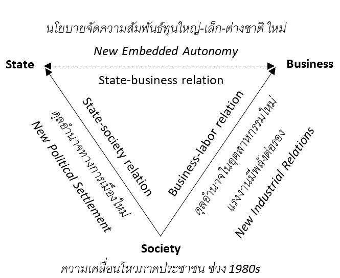 สภาวะก้ำกึ่งเช่นนี้ทำให้ไทยมีความเหลื่อมล้ำสูง และขาดโอกาสที่จะรับเทคโนโลยีหรือผลักดันการใช้แรงงานทักษะโดยทุนข้ามชาติ ดังนั้น เพื่อพาประเทศไทยหลุดไปจากข้อเสียทั้งสองด้านนี้ รัฐจำเป็นที่จะต้องปรับความสัมพันธ์กับกลุ่มทุนเสียใหม่