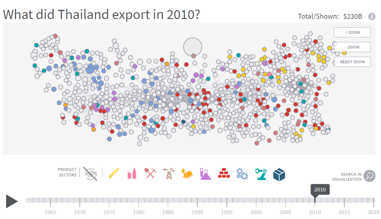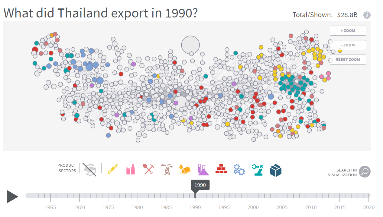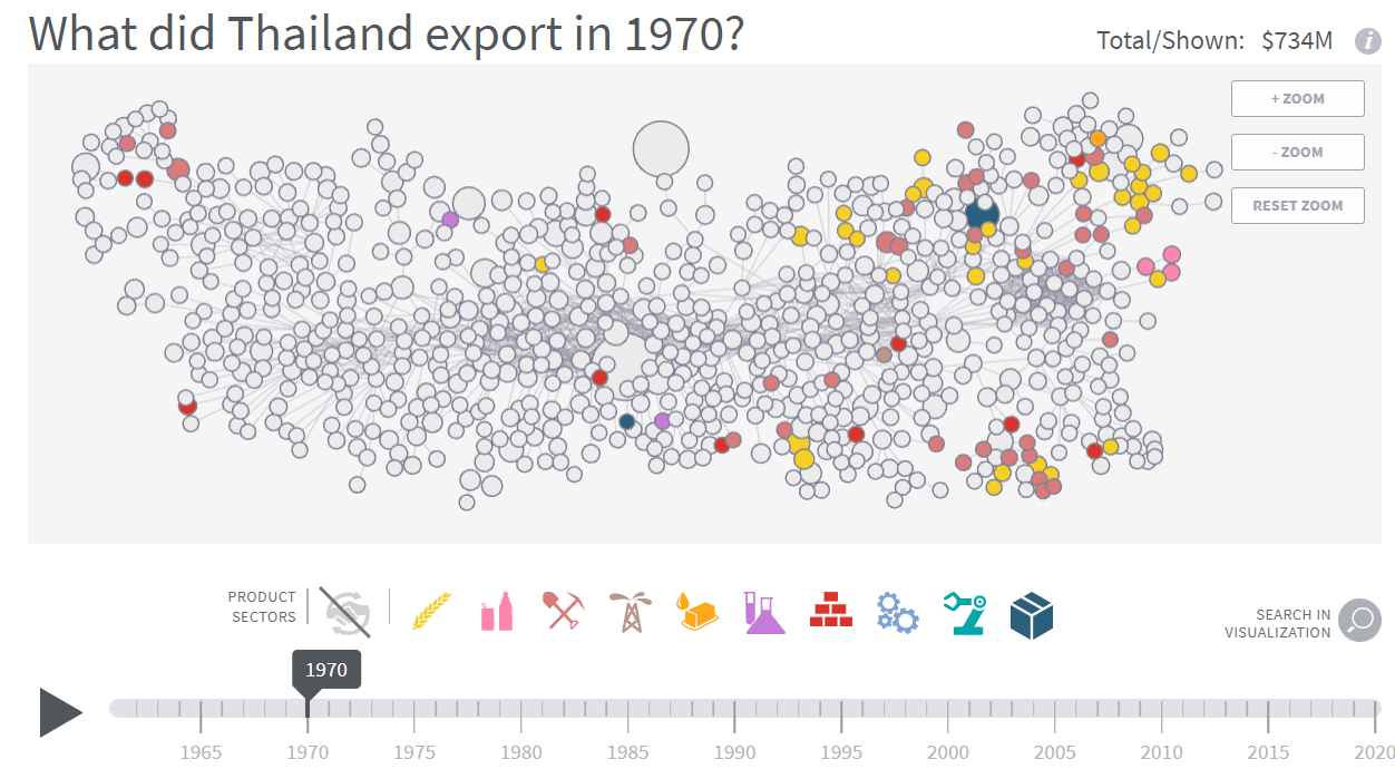 รูปที่ 4: ภาพชุดแสดงประเภิทสินค้าที่ประเทศไทยส่งออกในปี 1970, 1990, 2010 และ 2019 ตามลำดับ
