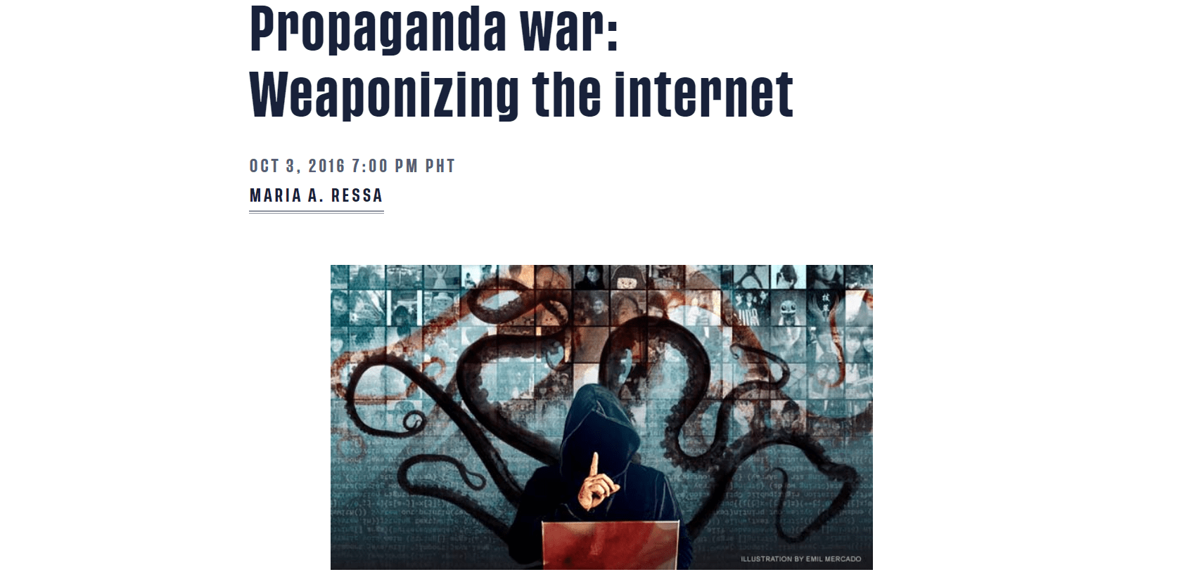 Propaganda war: Weaponizing the internet บทความชิ้นแรกในซีรีส์สืบสวนปฏิบัติการ IO ที่เชื่อมโยงกับดูเตร์เต