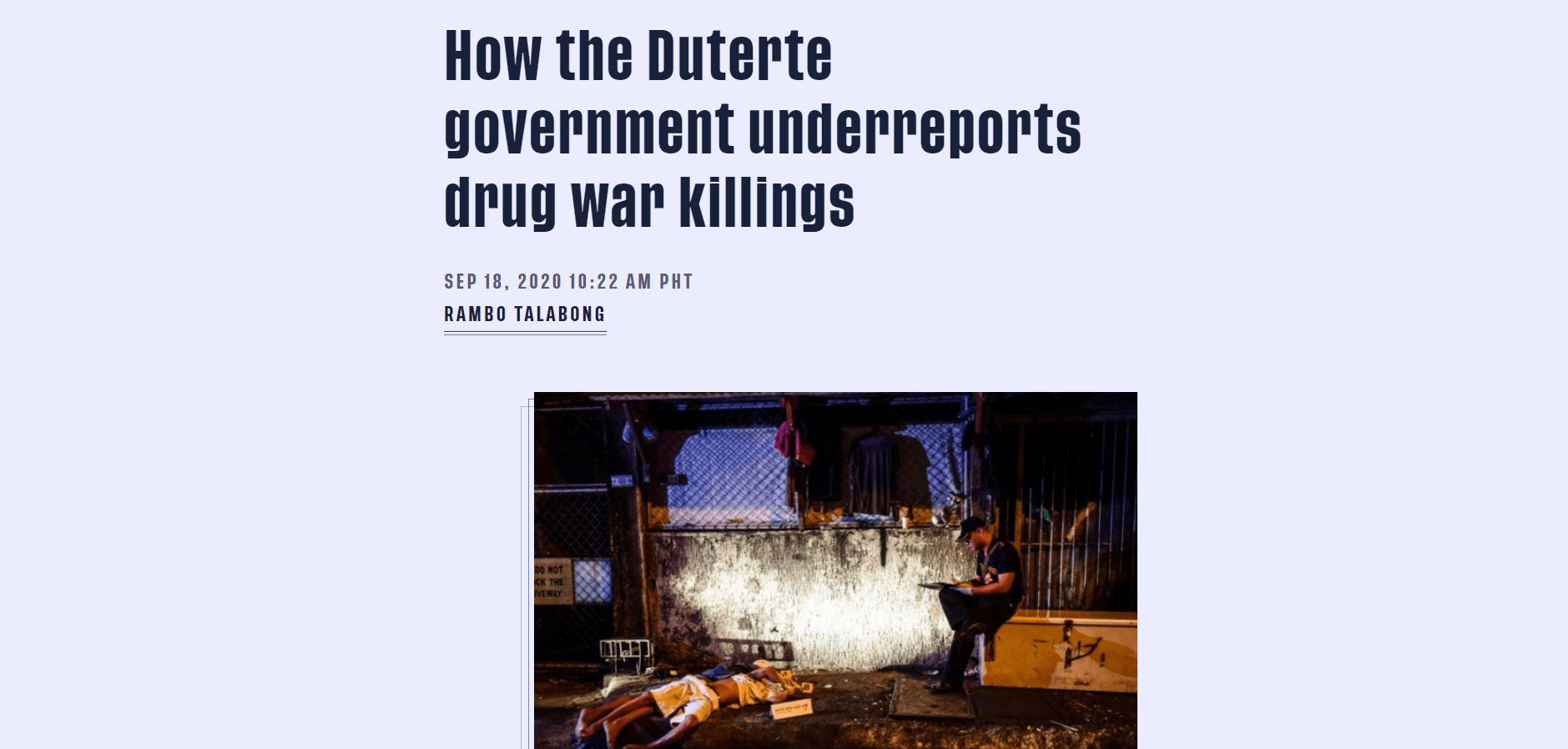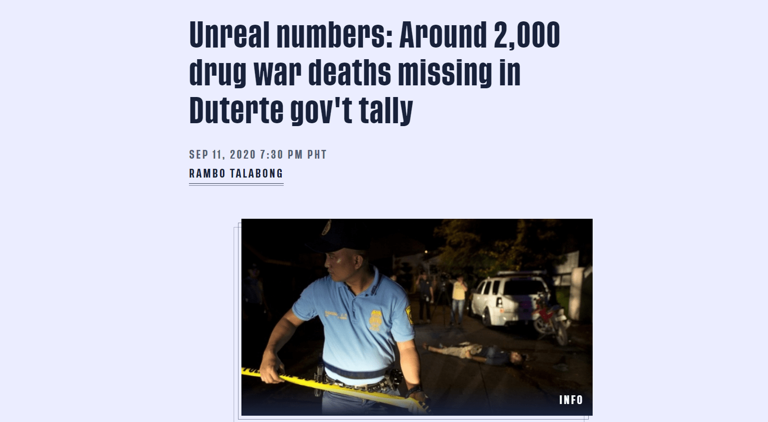 “เราคอยจับตารัฐบาลฟิลิปปินส์ในเรื่องนี้มาตลอดทุกฝีก้าว แต่ละวัน สำนักงานตำรวจแห่งชาติประกาศยอดผู้เสียชีวิตเพิ่มขึ้นทุกวันๆ จนในเดือนมกราคม 2017 ยอดรวมก็พุ่งไปถึงกว่า 7,000 คน ซึ่งเยอะมาก แล้วรัฐบาลก็น่าจะตระหนักได้ว่าทั่วโลกจับตามองเรื่องนี้อยู่ ต่อมาไม่นานเลขยอดรวมก็ลดลงมาเหลือ 2,000 คนเฉยเลย แน่นอนว่ามันไม่ปกติ นี่เป็นเหตุผลว่าทำไมสำนักข่าวเราถึงกัดเรื่องนี้ไม่ปล่อย”