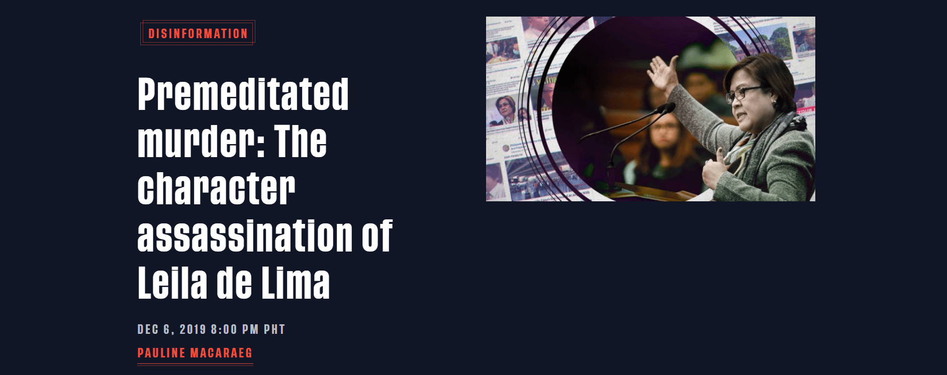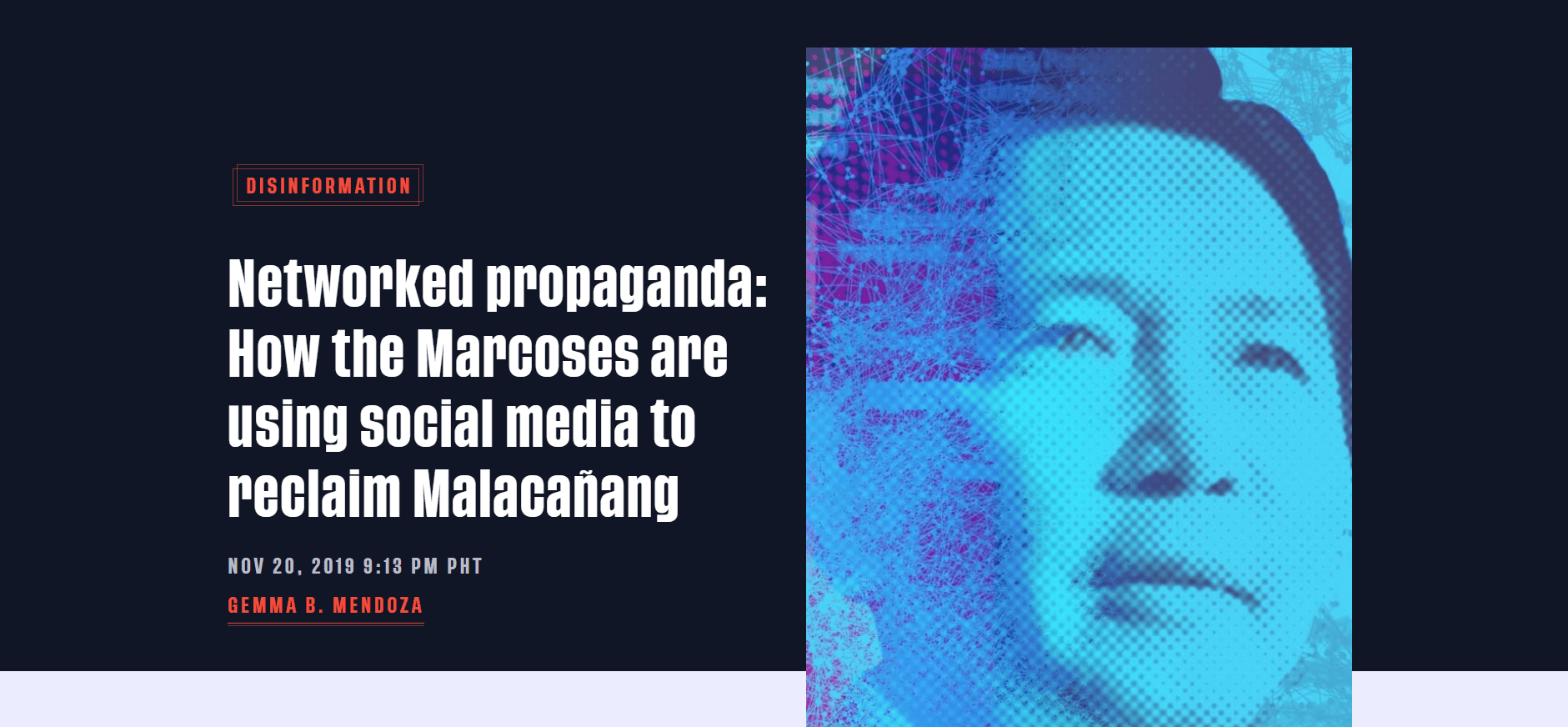 และอีกผลงานที่เป็นที่กล่าวขานก็คือซีรีส์สืบสวน 3 ตอนชุด ‘Networked Propaganda‘ โดยเจมมา เมนโดซา (Gemma Mendoza) ซึ่งตีแผ่เครือข่ายปฏิบัติการ IO ของตระกูลมาร์กอส (Marcos) ที่พยายามกู้ภาพลักษณ์ให้ตระกูลกลับมามีอำนาจได้อีกครั้ง หลังเคยเรืองอำนาจในยุคที่เฟอร์ดินานด์ มาร์กอส (Ferdinand Marcos) อดีตผู้นำเผด็จการฟิลิปปินส์ครองอำนาจช่วงทศวรรษ 60s-80s โดยรายงานชี้ว่าเครือข่าย IO ของมาร์กอสยังมีความเชื่อมโยงกับเครือข่ายของดูเตร์เตด้วย