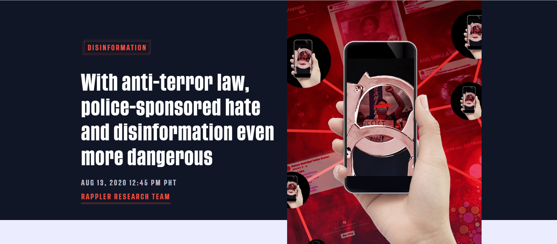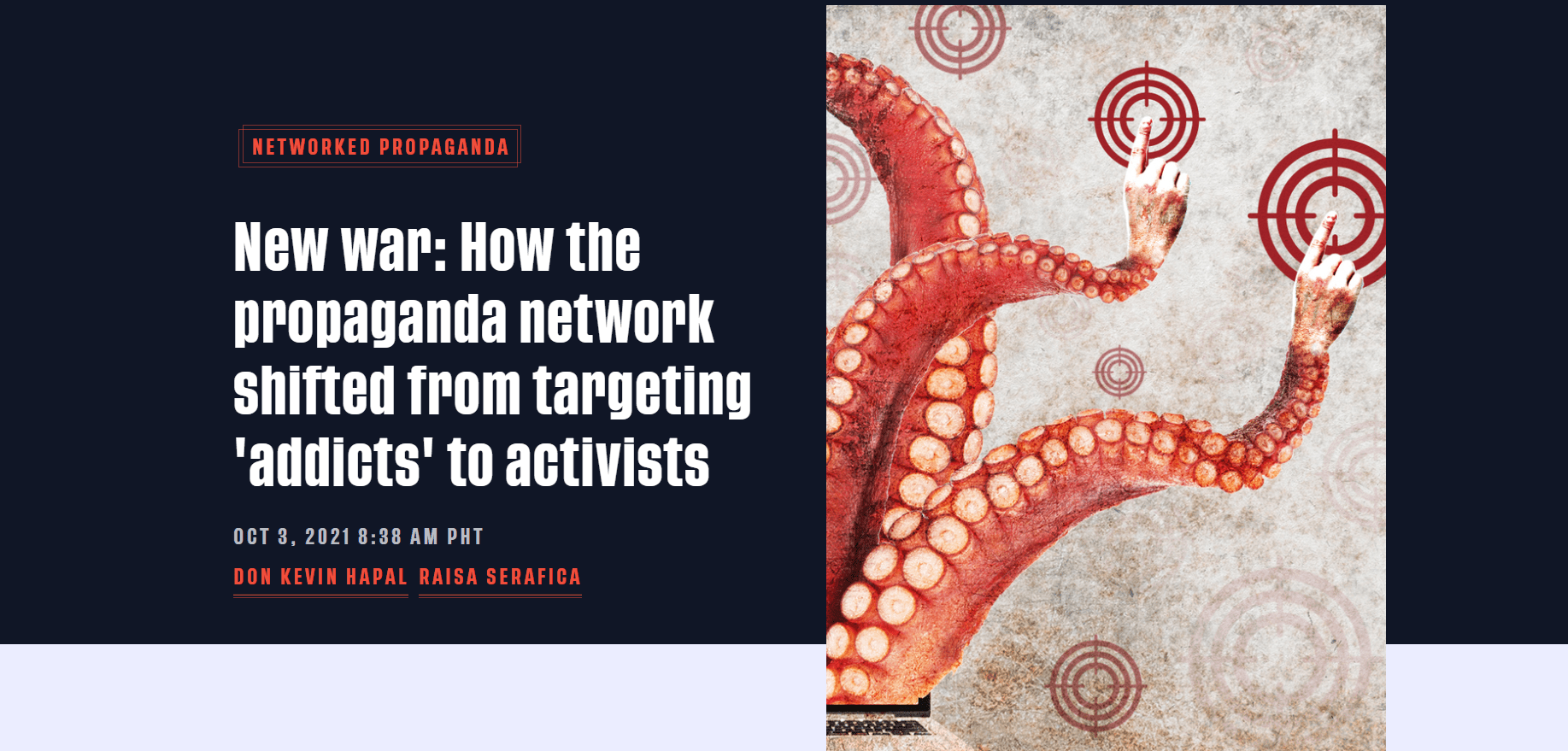 หนึ่งในผลงานโดดเด่นของ Rappler ที่ใช้ Sharktank เข้ามาช่วยสืบสวนคือ รายงานเรื่อง ‘New war: How the propaganda network shifted from targeting ‘addicts’ to activists’ โดยดอน เควิน ฮาปาล (Don Kevin Hapal) และไรซา เซราฟิกา (Raisa Serafica) เมื่อเดือนตุลาคม 2021 ซึ่งเล่าถึงขบวนการ IO ที่เชื่อมโยงกับดูเตร์เต ในปฏิบัติการโจมตีบรรดานักกิจกรรมฝั่งตรงข้าม โดยรายงานชิ้นนี้สามารถนำข้อมูลมาจำลองภาพให้เห็นความเชื่อมโยงของเครือข่ายชัดเจนขึ้น ทั้งยังเห็นพัฒนาการของการประดิษฐ์เรื่องราวและวาทกรรมในแต่ละช่วงเวลา