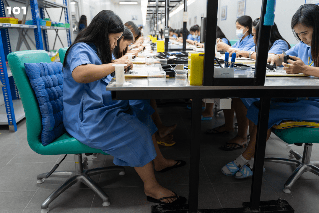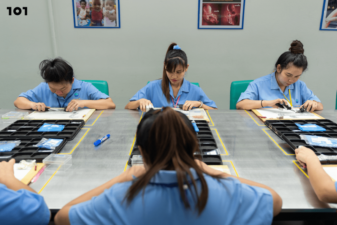 101 พาไปสำรวจบริษัท ‘แมริกอท จิวเวลรี่’ โรงงานผลิตอัญมณีในนิคมอุตสาหกรรมย่านชานเมือง ทั้งในมุมของพนักงานว่าพวกเขาได้รับสวัสดิการอย่างไร โดยเฉพาะสวัสดิการที่ส่งเสริมการมีบุตร รวมถึงมุมมองในฝั่งโรงงานว่าอะไรคือแนวคิดเบื้องหลังในการจัดสวัสดิการให้กับพนักงาน