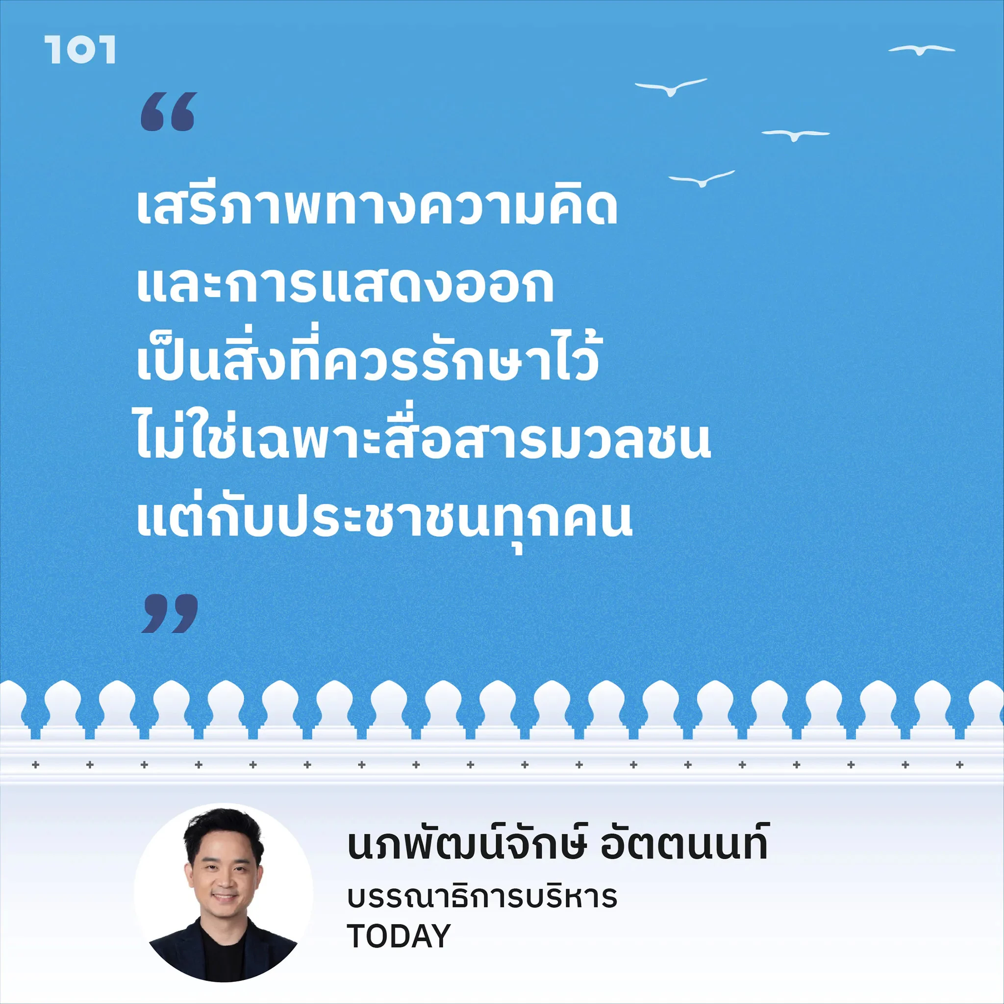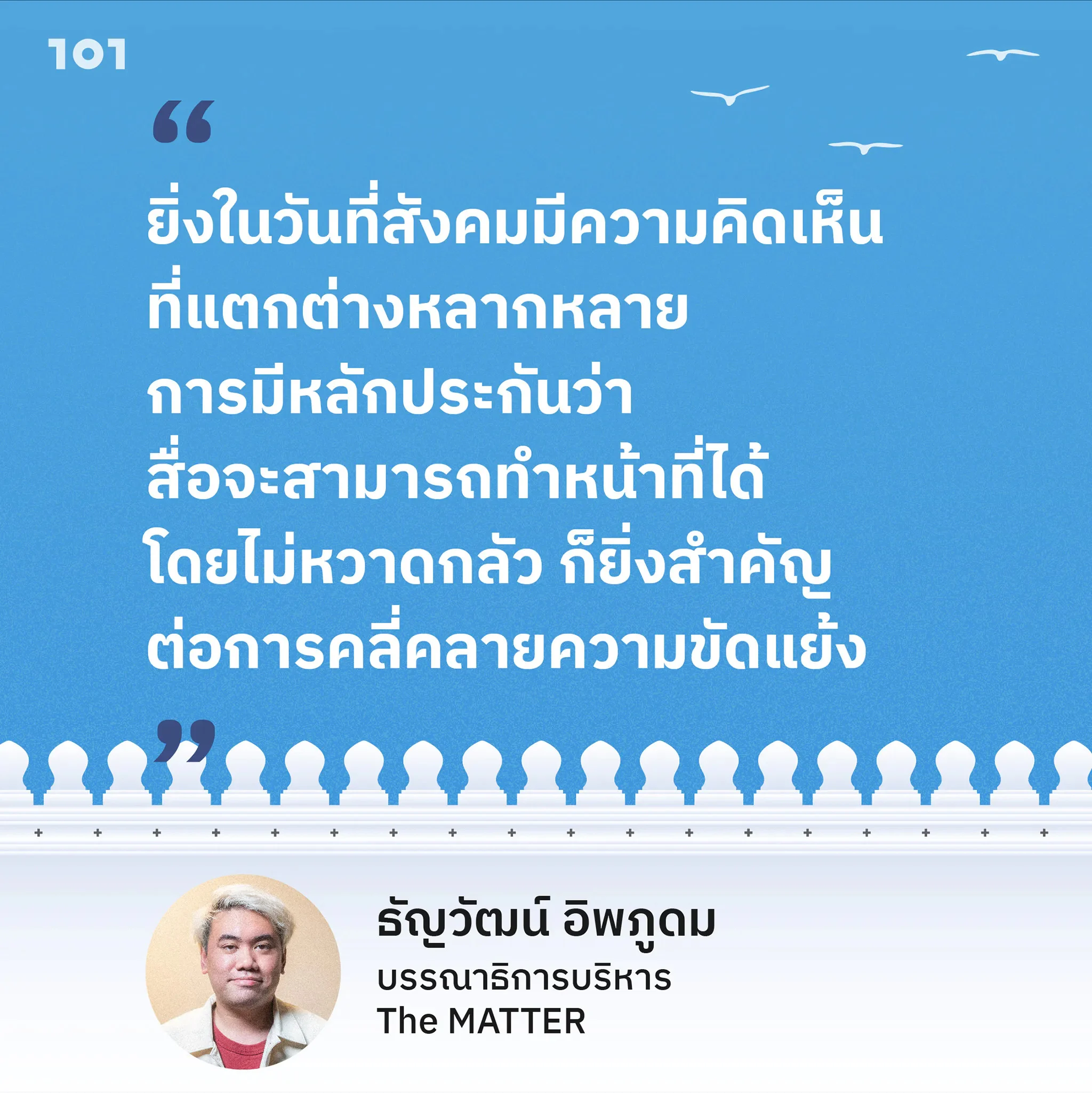 “เสรีภาพสื่อเป็นตัวชี้วัดสุขภาพของสังคมประชาธิปไตย ยิ่งในวันที่สังคมมีความคิดเห็นที่แตกต่างหลากหลาย การมีหลักประกันว่าสื่อจะสามารถทำหน้าที่ได้โดยไม่หวาดกลัวก็ยิ่งสำคัญต่อการคลี่คลายความขัดแย้ง”