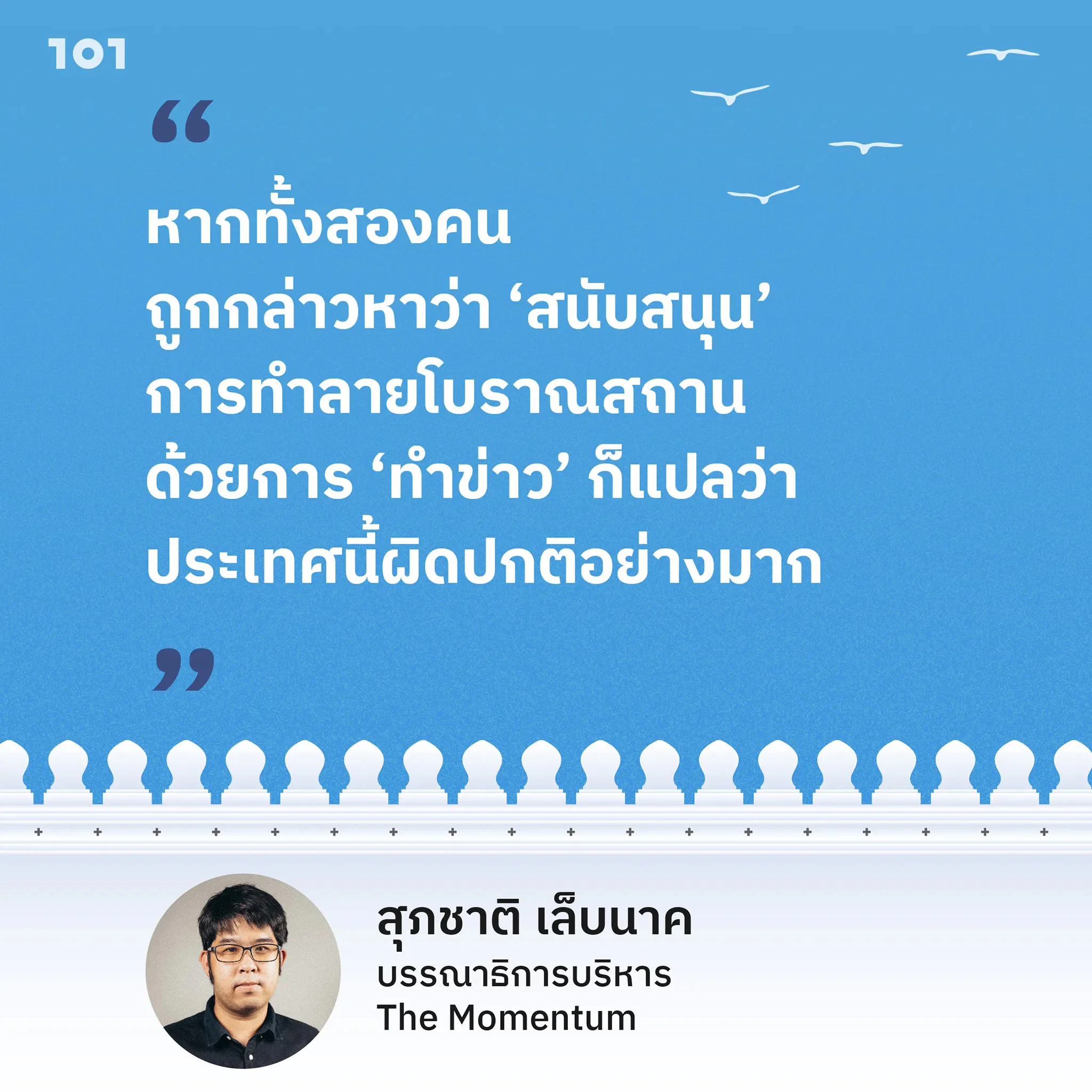 “เรื่องต่อมาคือหากทั้งสองคนถูกกล่าวหาว่า ‘สนับสนุน’ การทำลายโบราณสถานด้วยการ ‘ทำข่าว’ ก็แปลว่าประเทศนี้ผิดปกติอย่างมาก