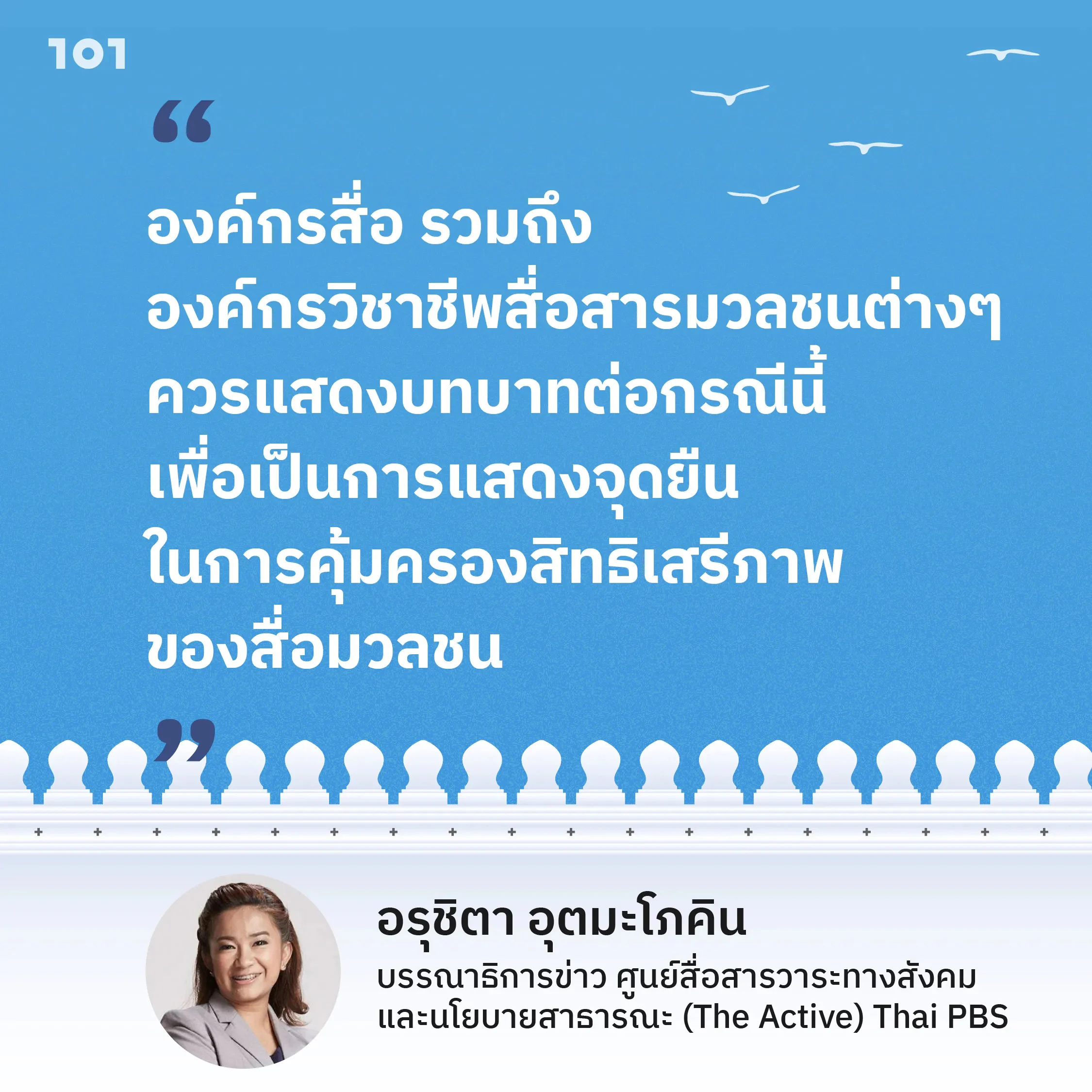 “ที่สำคัญ องค์กรสื่อ รวมถึงองค์กรวิชาชีพสื่อสารมวลชนต่างๆ ควรแสดงบทบาทต่อกรณีนี้ เพื่อเป็นการแสดงจุดยืนในการคุ้มครองสิทธิเสรีภาพของสื่อมวลชน ไม่ให้ส่งผลกระทบต่อการทำหน้าที่ของสื่อมวลชนหลังจากนี้”