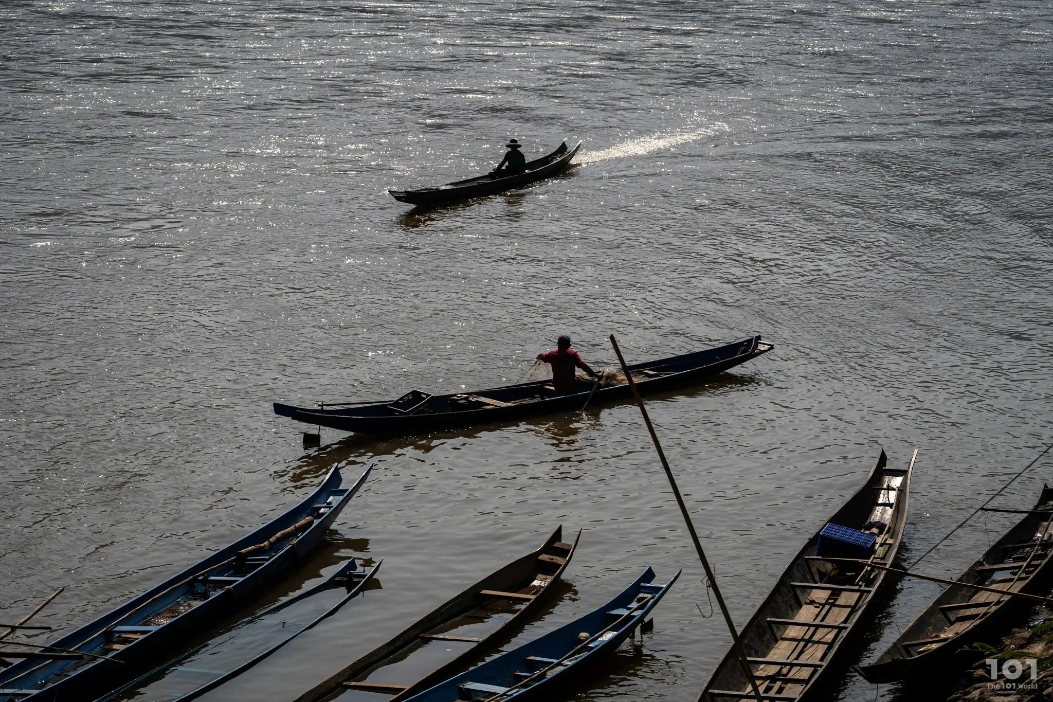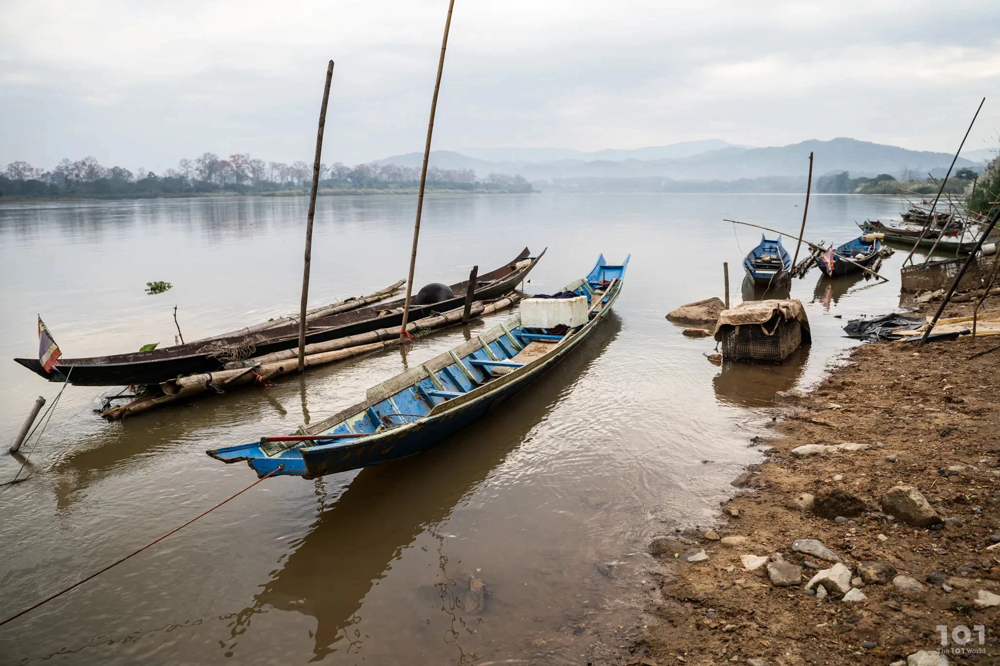 เมื่อก้าวเท้าไปประชิดริมน้ำโขงอีกนิดหนึ่ง ภาพที่ปรากฏต่อเรามีเพียงเรือกาบที่จอดเรียงรายริมน้ำอย่างนิ่งสนิท พร้อมอุปกรณ์หาปลานานาชนิดที่วางกระจัดกระจายโดยรอบ แต่กลับไร้ซึ่งผู้คนอื่นใดตรงนั้นนอกจากพวกเรา