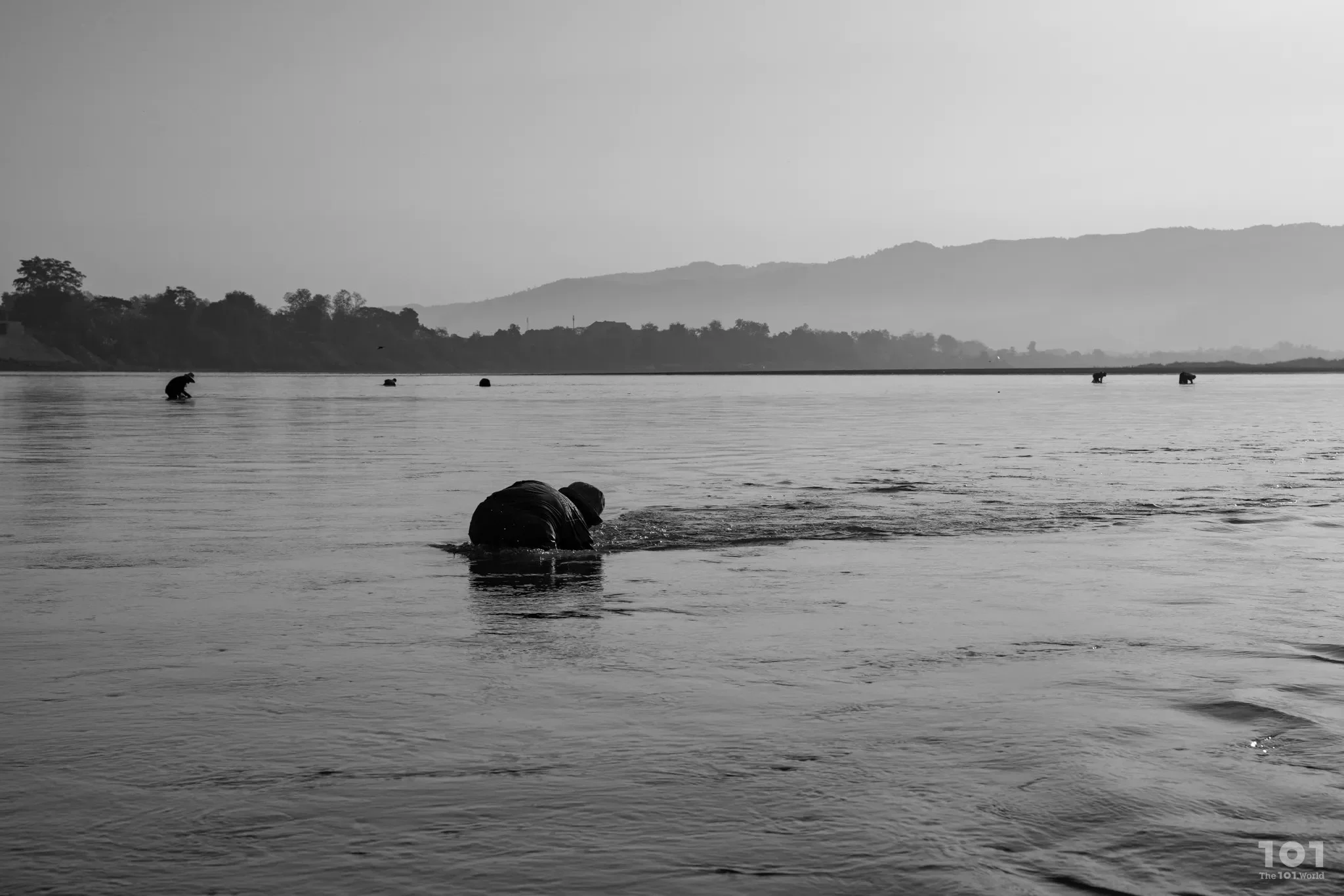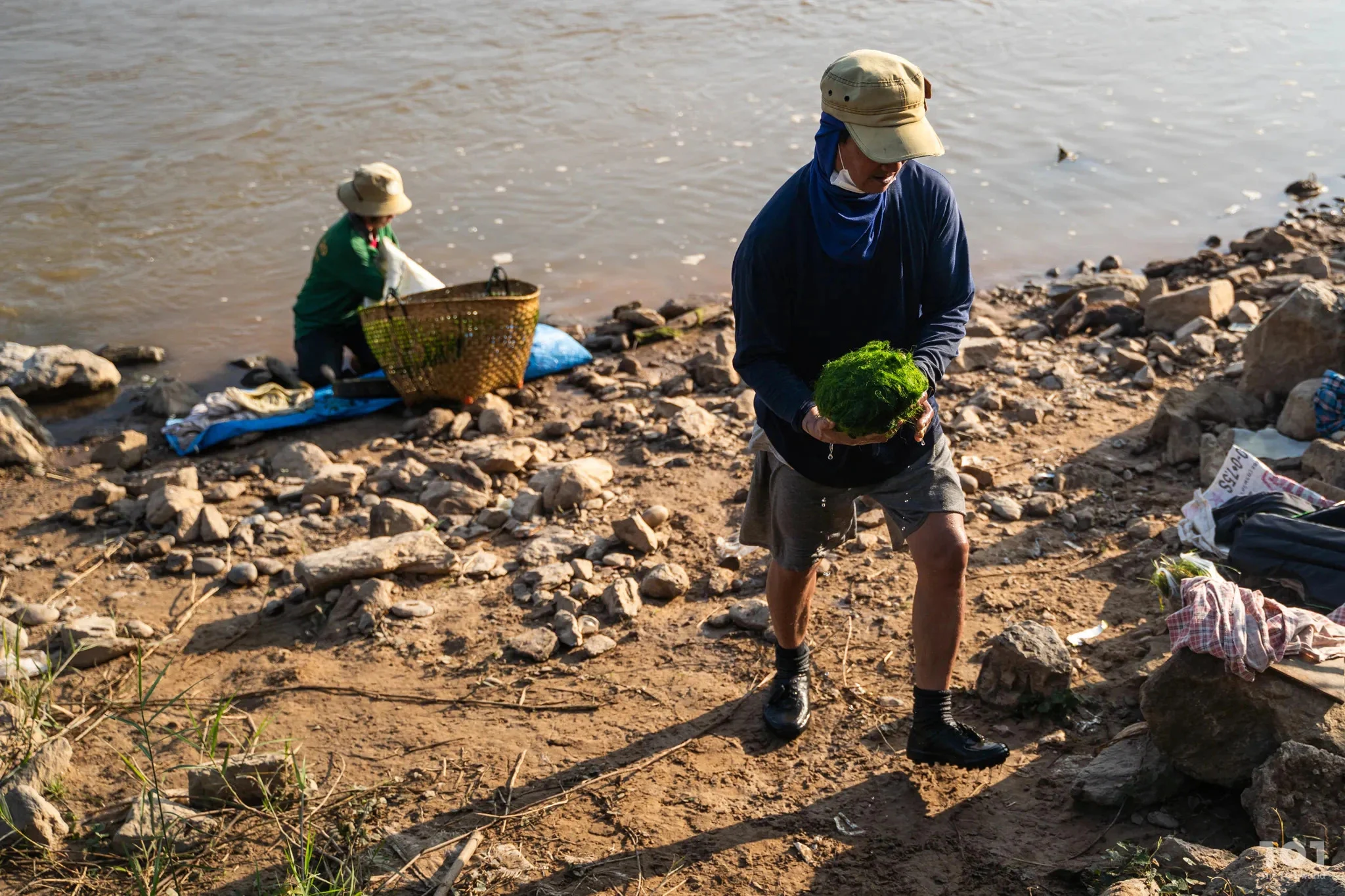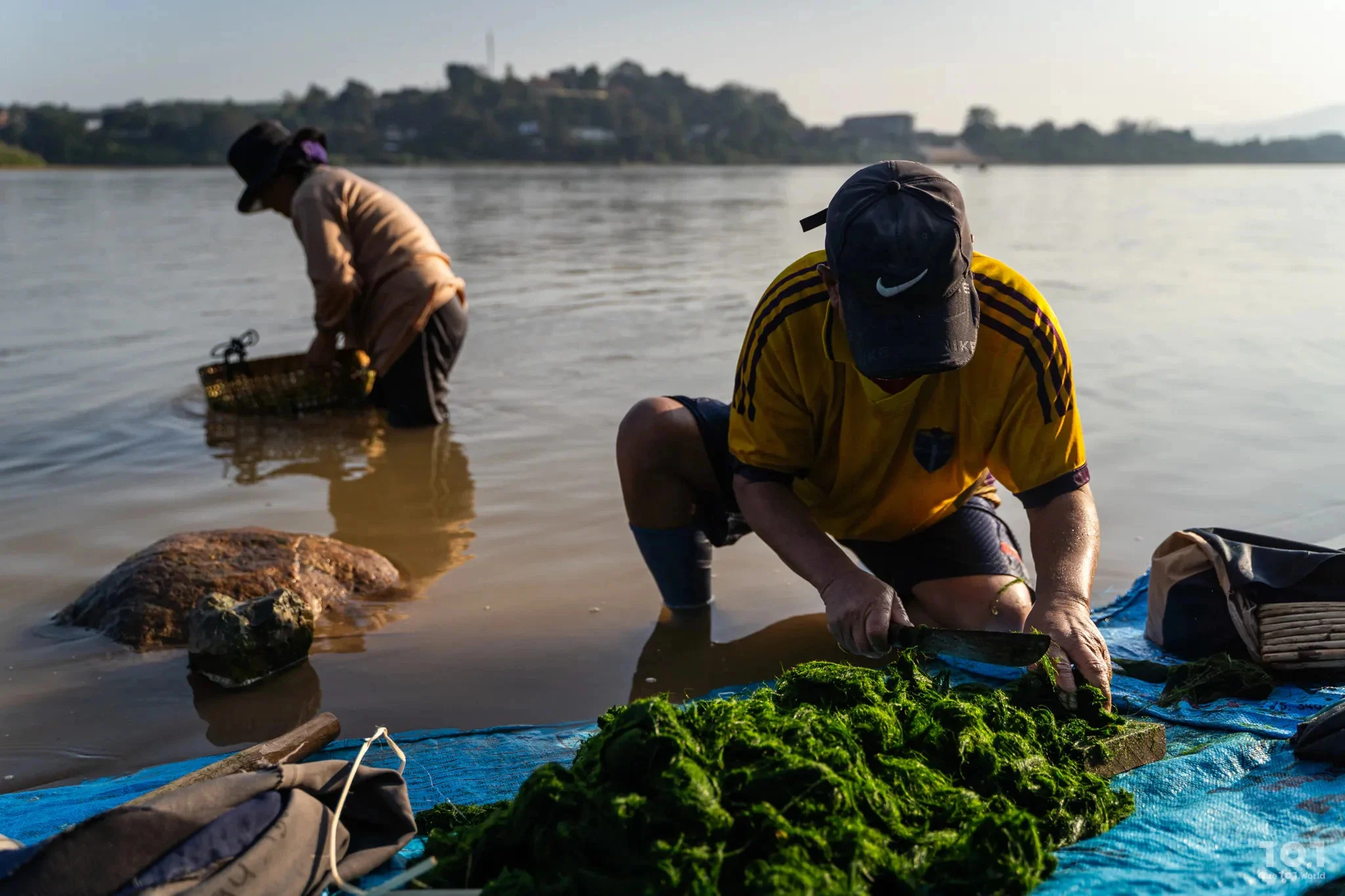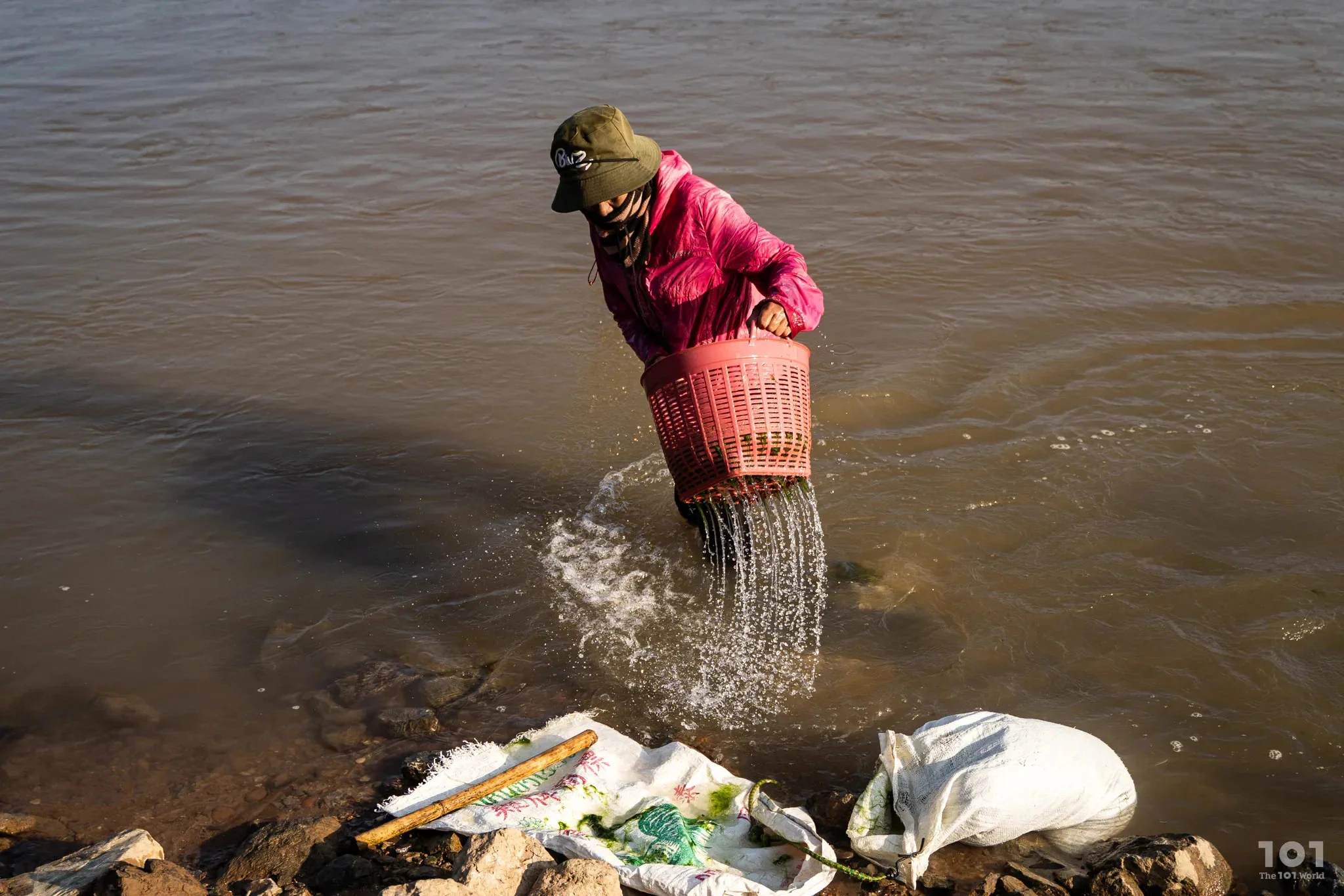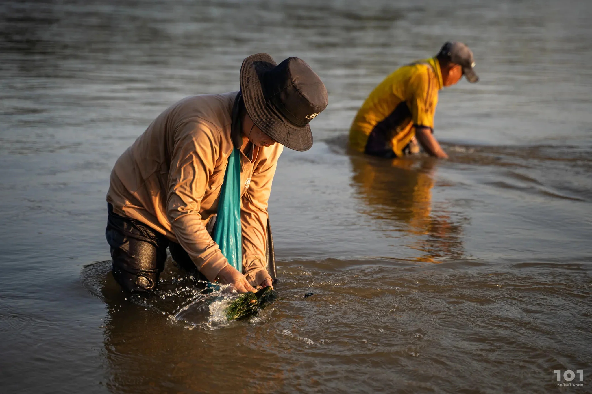 ในยามย่ำรุ่งกลางอากาศหนาวปลายเดือนมกราคม ขณะที่ดวงตะวันค่อยๆ โผล้พ้นขอบฟ้า เราเห็นชาวบ้านหาดไคร้กลุ่มเล็กๆ ไม่ถึง 10 คน ยืนก้มๆ เงยๆ กลางแม่น้ำโขง ขณะที่เรายืนมองไกลๆ จากเนินดินริมฝั่งน้ำนั้น ชาวบ้านก็เดินเข้ามาบริเวณนั้นเพิ่มขึ้นทีละคนสองคน เพื่อจะเดินลุยสายน้ำเชี่ยวกรากไปยังจุดที่เหล่าผู้มาถึงก่อนหน้ายืนอยู่ พวกเขาบอกกับเราว่ากำลังจะเดินไปตรงนั้นเพื่อเก็บ ‘ไก’