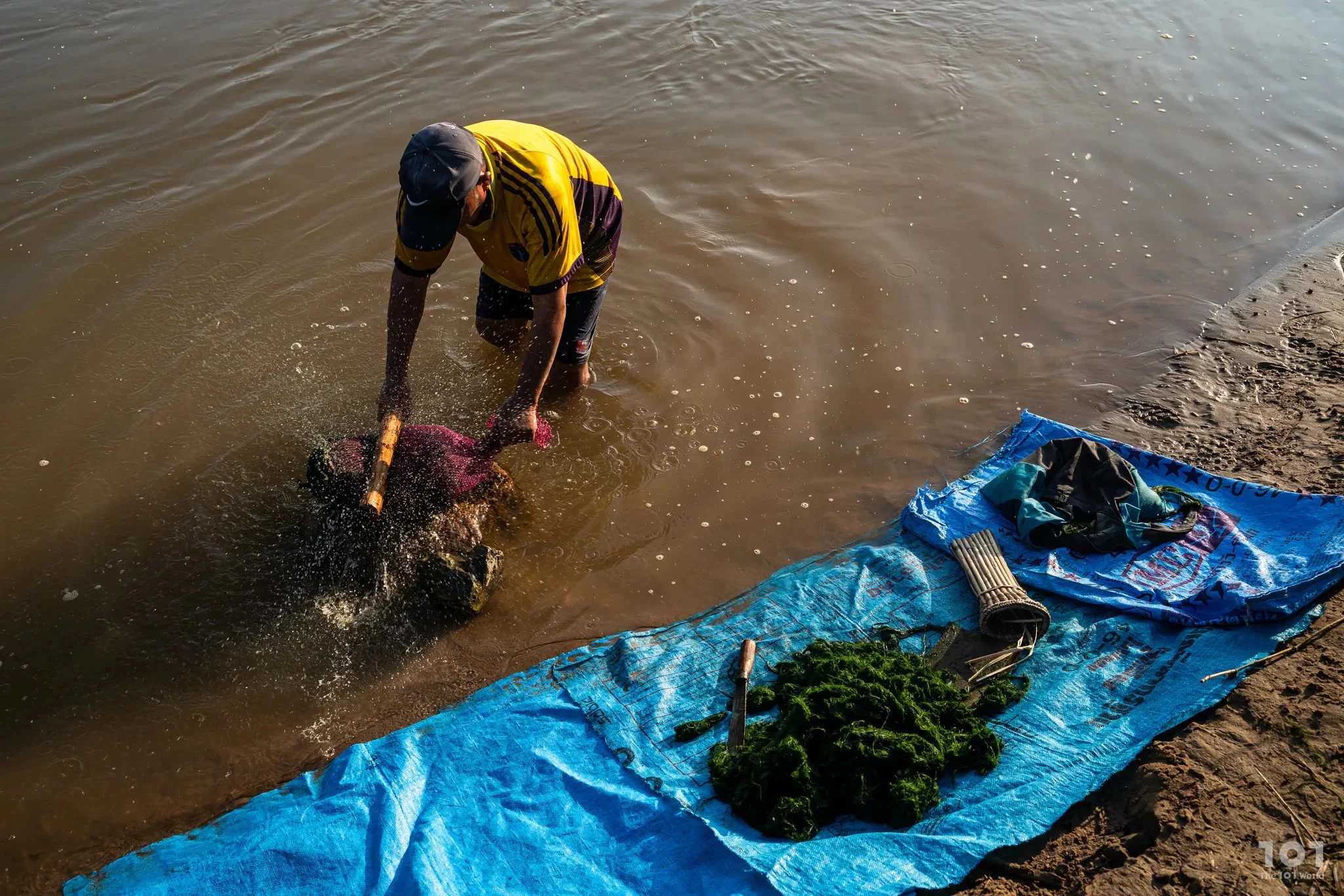 “น่าจะแค่สี่กิโล” ลุงวัย 66 อีกคนที่เดินตามขึ้นฝั่งมา กะปริมาณของไกที่เก็บได้ให้ฟัง พลางนำไกร่อนในตะกร้าล้างน้ำและเอาไม้ทุบไกเพื่อเอาเศษหินดินทรายออกไปพร้อมกัน