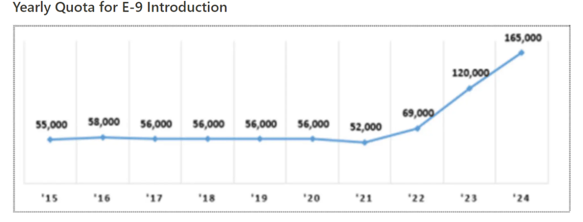 ในปี 2023 เกาหลีใต้มีแรงงานที่ไม่ได้ถือสัญชาติเกาหลีไหลเวียนอยู่ในภาคการผลิตและบริการอยู่ 923,000 คน เพิ่มสูงขึ้นจากปี 2022 ถึง 10% ในจำนวนนี้มีแรงงานสัญชาติจีนมากที่สุด (35.3 %) ตามมาด้วยสัญชาติเวียดนาม (11.3 %) หากขยายเข้าไปดูตัวเลขเหล่านี้จะพบว่ามีแรงงานทักษะต่ำ (Low-skilled workers) อยู่มากกว่า 300,000 คน ที่เข้ามาทำงานด้วยวีซ่าการทำงานชั่วคราว และมีแรงงานต่างชาติมากถึง 430,000 คน ที่เป็นกลุ่ม Overstay Visa คือพักอาศัยหรือทำงานในเกาหลีเกินระยะเวลาที่กำหนด ในปี 2024 นี้ รัฐบาลเกาหลีเพิ่มโควตาการให้วีซ่าแรงงานข้ามชาติประเภท E-9 (แรงงานทั่วไป) อีก 165,000 คน ซึ่งเป็นจำนวนที่เพิ่มขึ้นเป็นสองเท่าจากสมัยประธานาธิบดีมุน แจอิน สะท้อนว่านับวัน เกาหลีใต้จะยิ่งพึ่งพาแรงงานจากต่างประเทศในสัดส่วนที่มากขึ้น